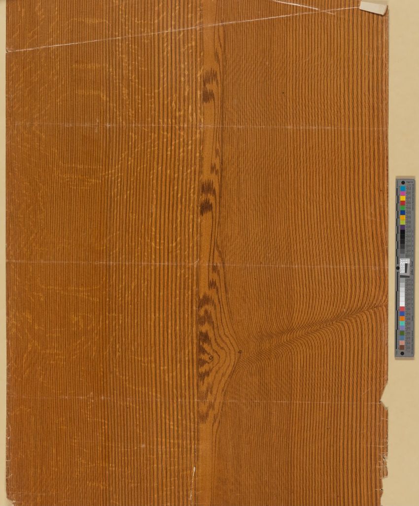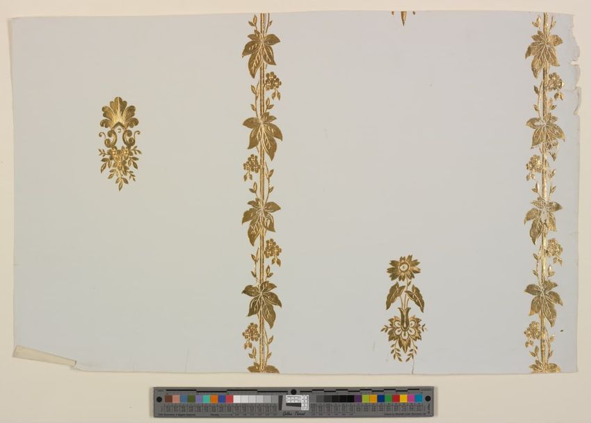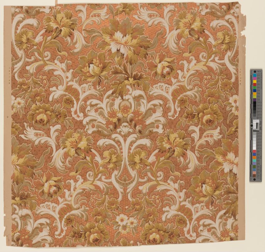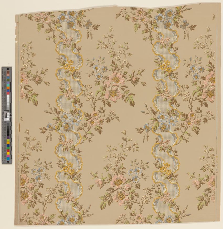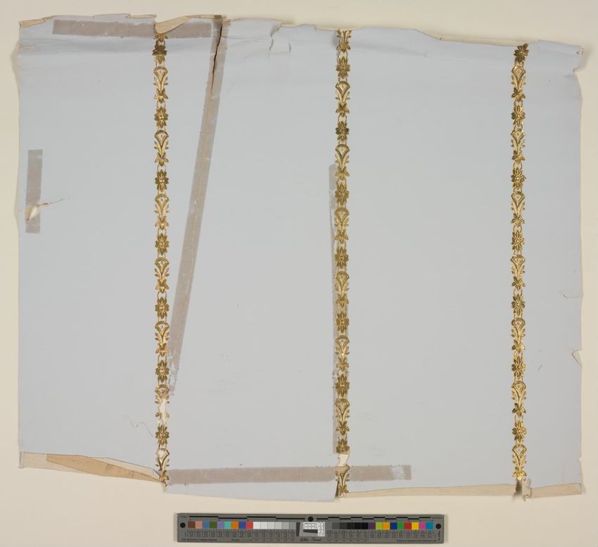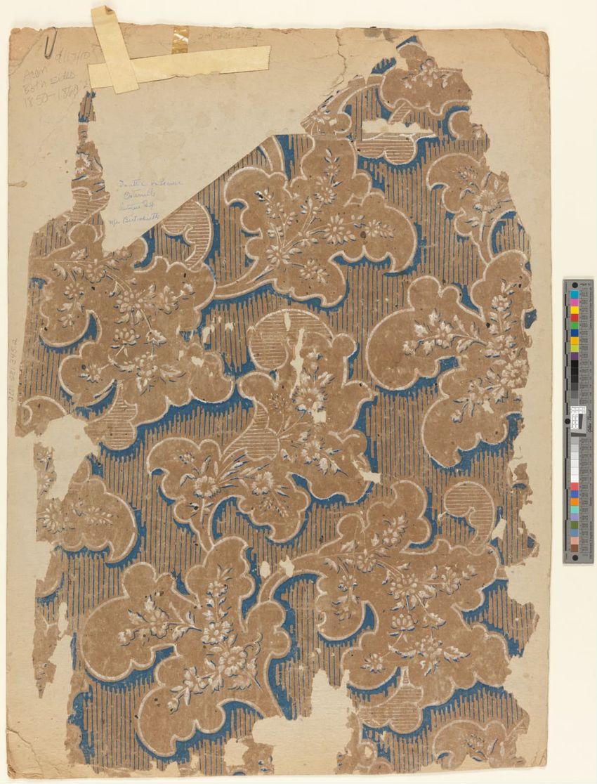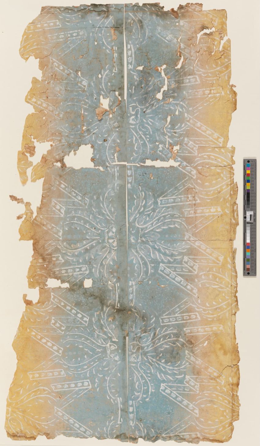 Fragment of "Peacock Paper" reproduction, torn in two, from The Wayside in Concord, Massachusetts. Vignettes of colorful birds, including peacocks. Roller-printed in two blues, two greens, two pinks, red, gray, brown, tan, two mauves, white and black on a light lavender ground with small diamond p...