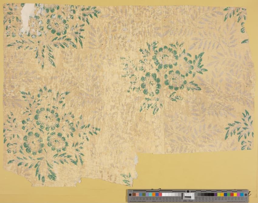Multiple large fragments of Gothic Revival stripe paper. Pattern consists of vertical stripes of Gothic architecture, complete with pointed arches, tracery, balustrades, quatrefoils and foliage. Printed in tan, three browns, and blue on a satin ground.