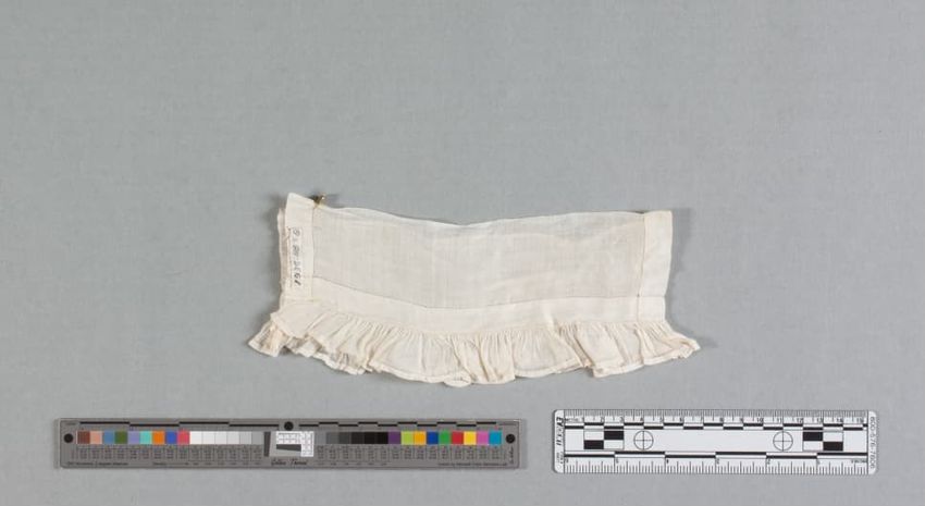 White cotton; high V-neckline; shirred & smocked V-shaped front & back; short sleeves w/ embroidered eyelet trim. Boning has been removed from darts & seams; rounded point at front waist; lined w/ heavy white cotton twill. Hook & eye closure; piping at neck, armscye & waist.