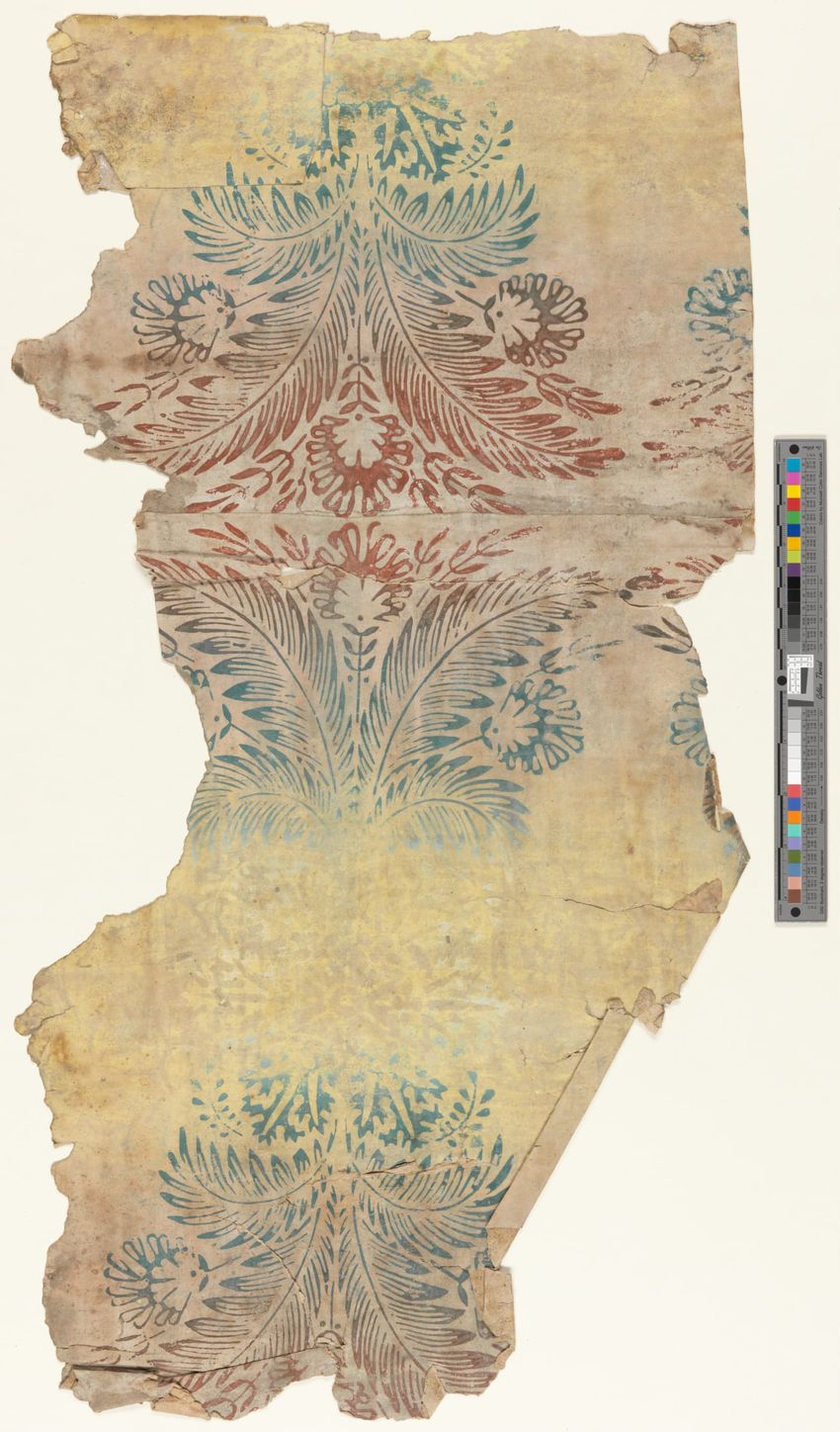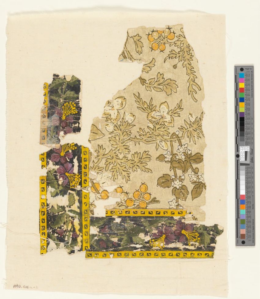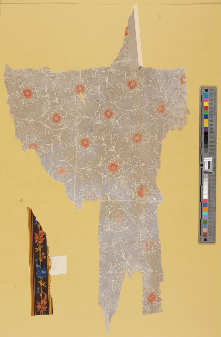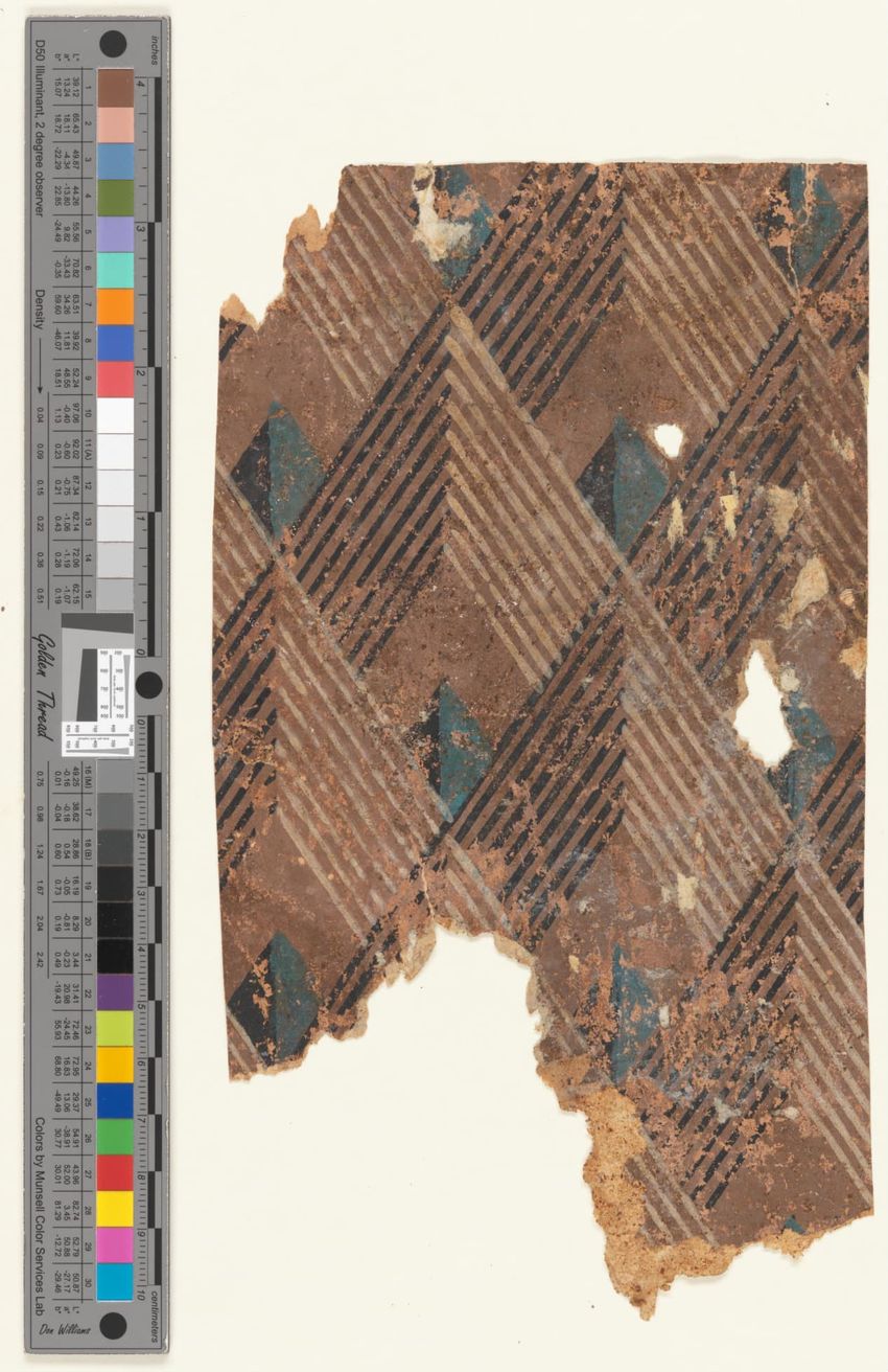 Two fragments. In the style of Charles Rennie MacIntosh, very stylized roses, rosebuds, leaves and stems. Superimposed on allover, horizontal dash pattern and vertical long dash pattern consisting of groups of three. Red, two greens, white and black on yellow-brown ground.