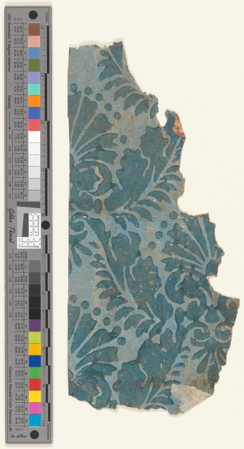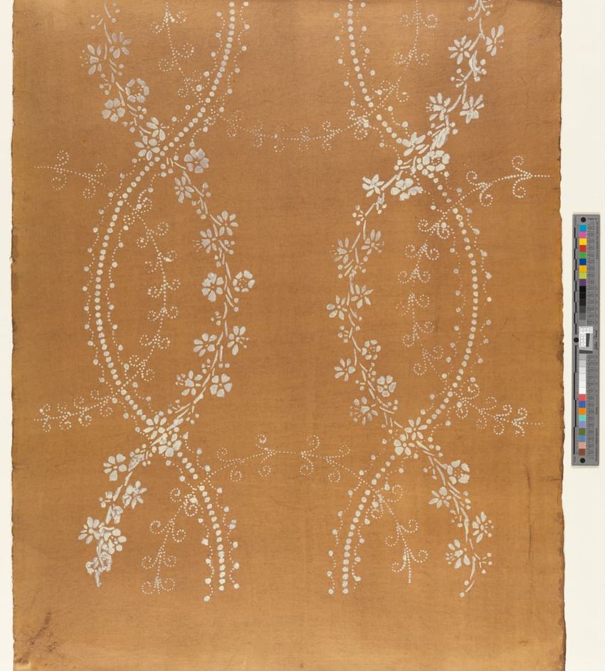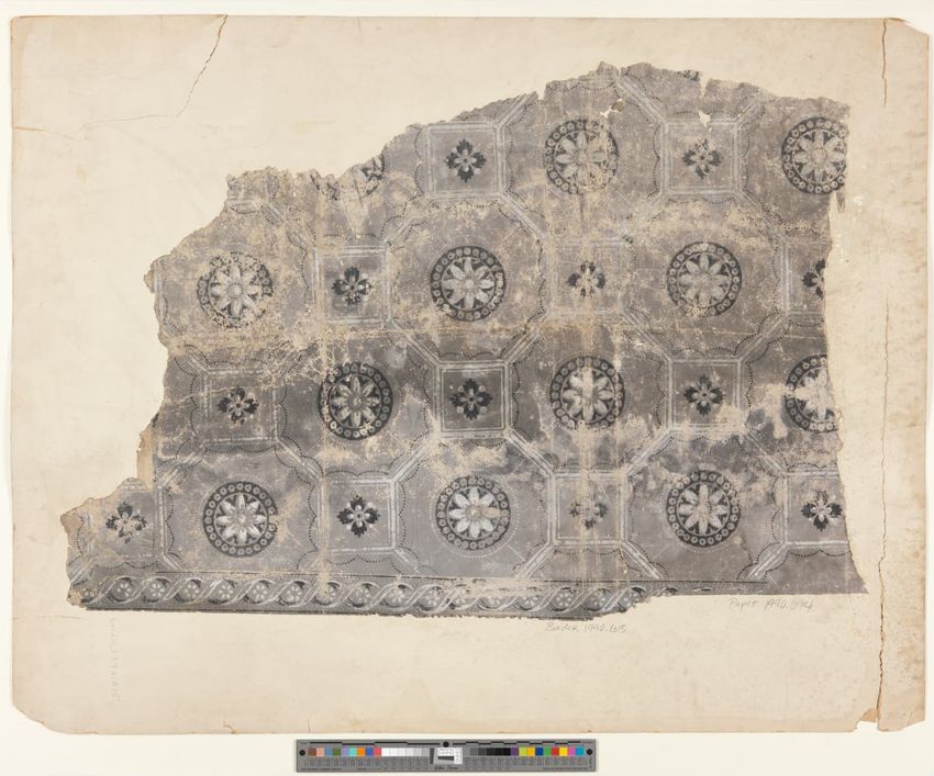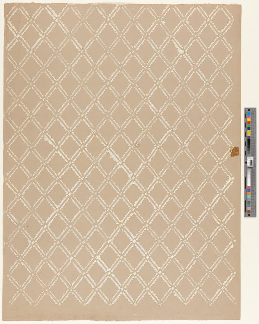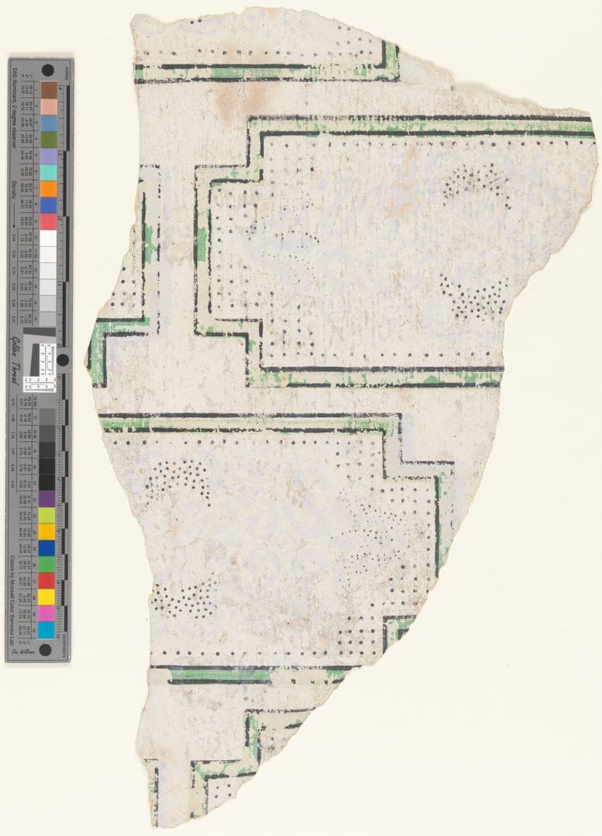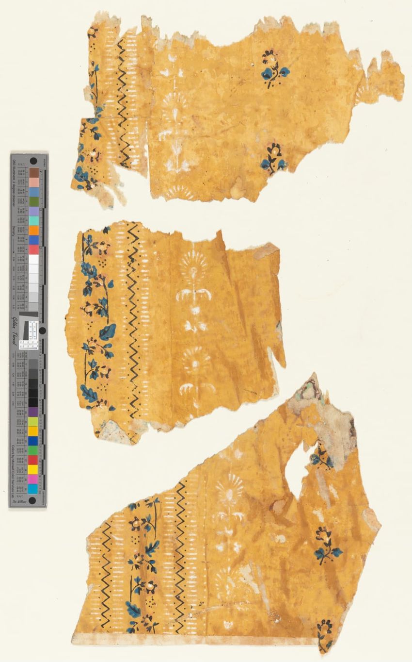 Two fragments. In the style of Charles Rennie MacIntosh, very stylized roses, rosebuds, leaves and stems. Superimposed on allover, horizontal dash pattern and vertical long dash pattern consisting of groups of three. Red, two greens, white and black on yellow-brown ground.