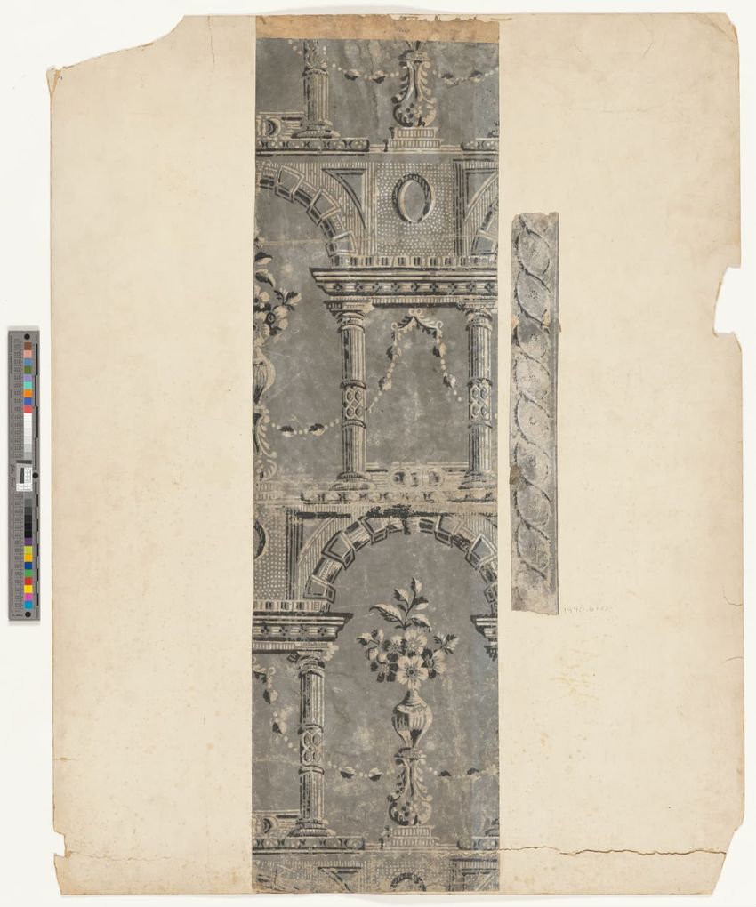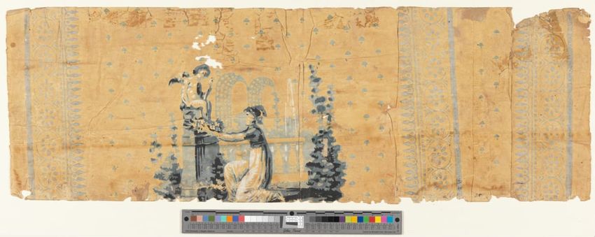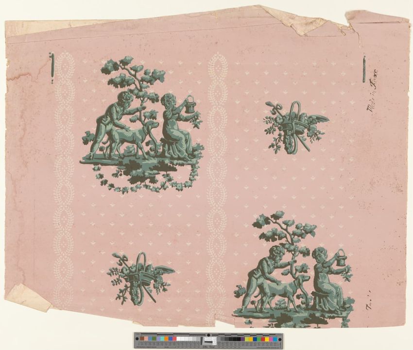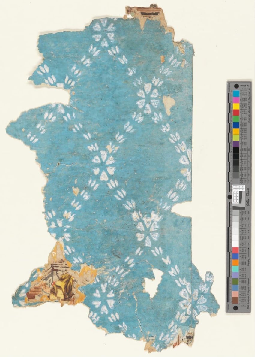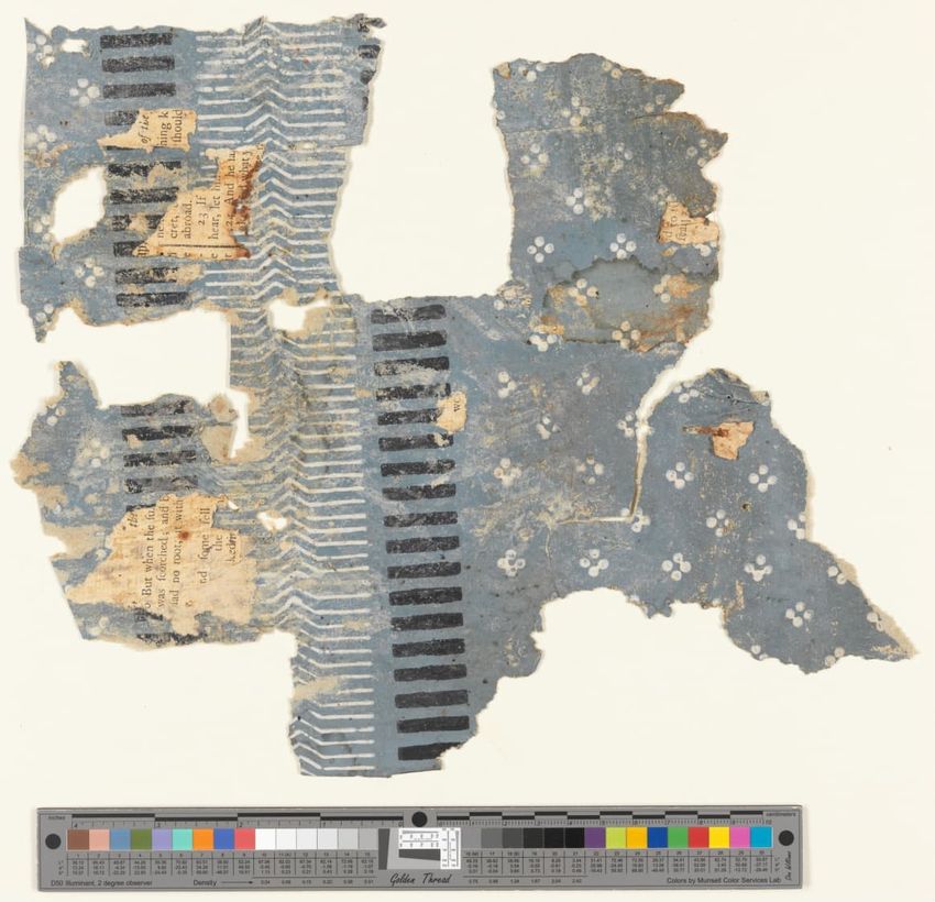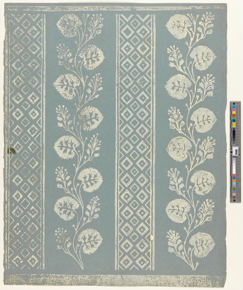 Two fragments. In the style of Charles Rennie MacIntosh, very stylized roses, rosebuds, leaves and stems. Superimposed on allover, horizontal dash pattern and vertical long dash pattern consisting of groups of three. Red, two greens, white and black on yellow-brown ground.