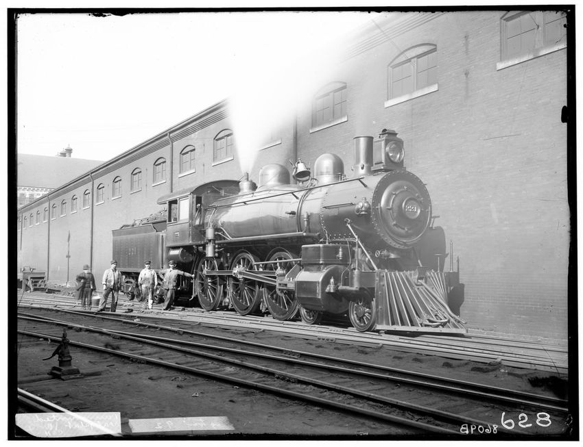 The image shows Locomotive #221, a 4-6-0 passenger train, positioned on railway tracks next to a brick building with large windows. Several men in work attire are standing beside the locomotive, which features prominent components such as a headlight, smokestack, and bell. The scene appears to be in...