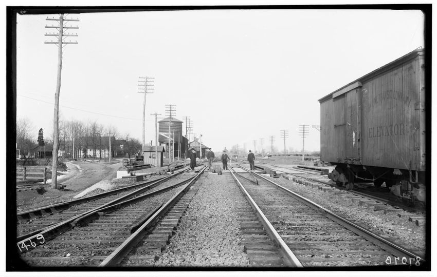 The image shows a set of railroad tracks with five people standing on or near them in Kinderhook, New York. To the right, there is a freight car with the word "ELEVATOR" partially visible. In the background, there are several utility poles and buildings, including a small structure near the tracks.