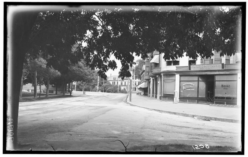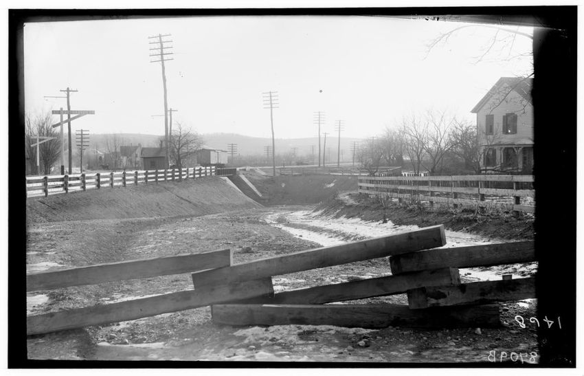 At Boylston Street, looking east showing Boston and Worcester Street railway trestle, Newton Highlands, Newton, Massachusetts, 9021-B