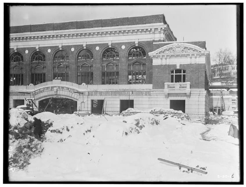 The image shows the construction of a new passenger station in Pittsfield, Massachusetts. The partially built structure features a prominent brick facade with large arched windows and decorative architectural elements. Snow is visible on the ground in front of the building, and various construction ...