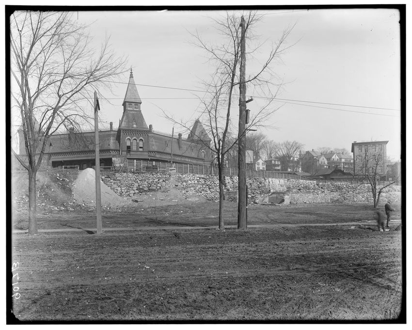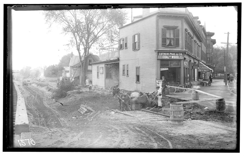 The image shows a view of the Walnut Street railroad crossing, looking northwest from near the center of the crossing in Newton Highlands, Newton, Massachusetts. In the foreground, there is some construction activity with workers and a horse-drawn cart. To the right, there is a building with a sign ...