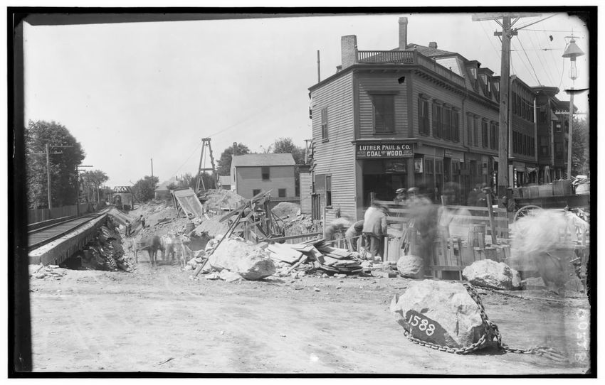 The image depicts the Walnut Street railroad crossing looking northwest in Newton Highlands, Newton, Massachusetts. Visible in the foreground is a construction scene with workers engaged in activities among large rocks and wooden materials. A building labeled "Luther Paul & Co. Coal & Wood" is on th...