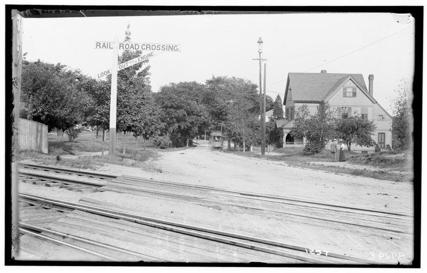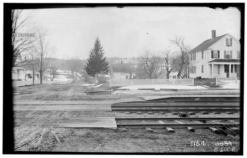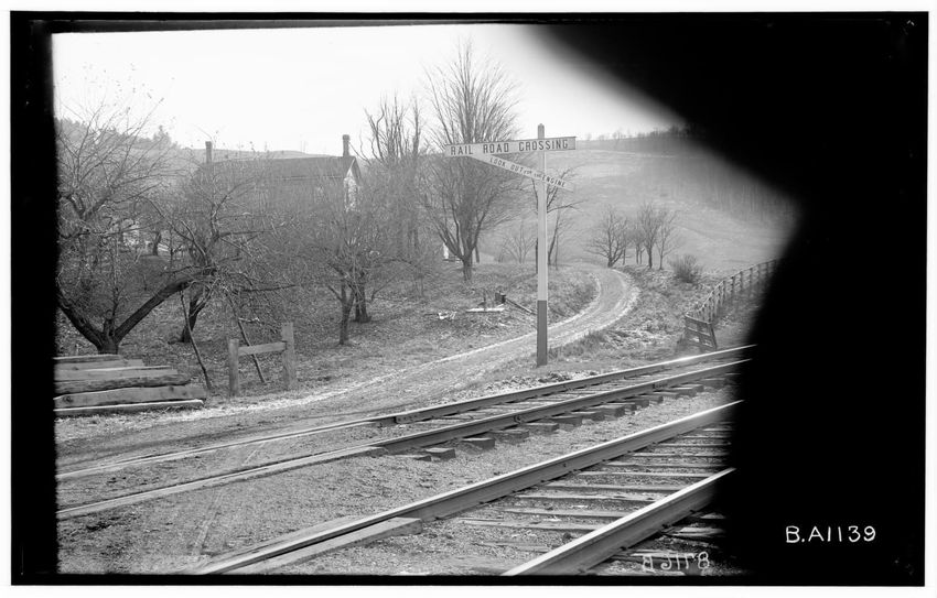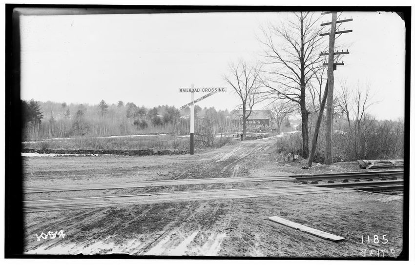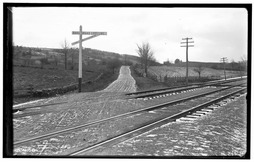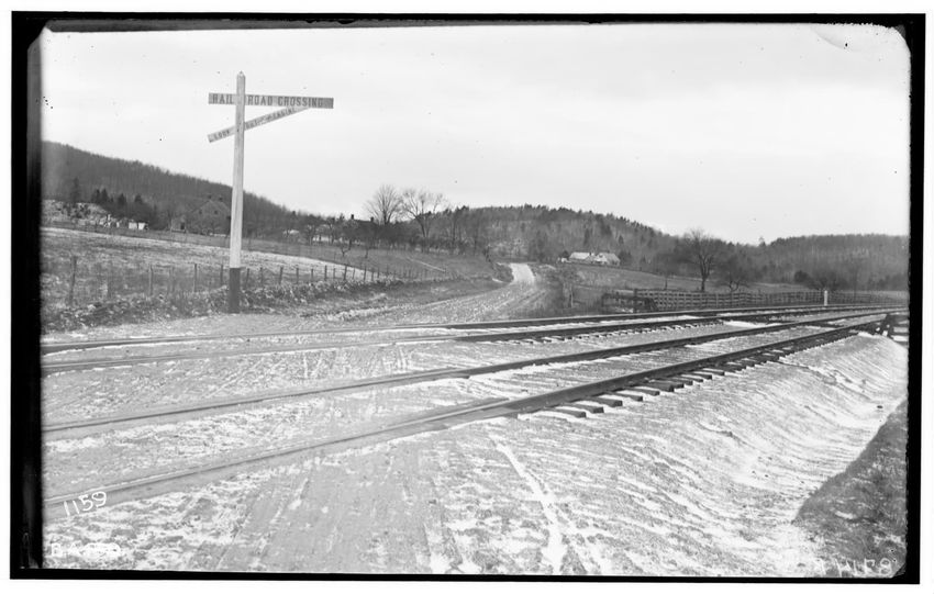 The image shows a railroad crossing at Flint's Main crossing area, looking north in Canaan, New York. There is a sign labeled "RAILROAD CROSSING" and "LOOK OUT FOR THE CARS." The scene includes railroad tracks crossing a dirt road, with a rural landscape in the background featuring hills, trees, and...