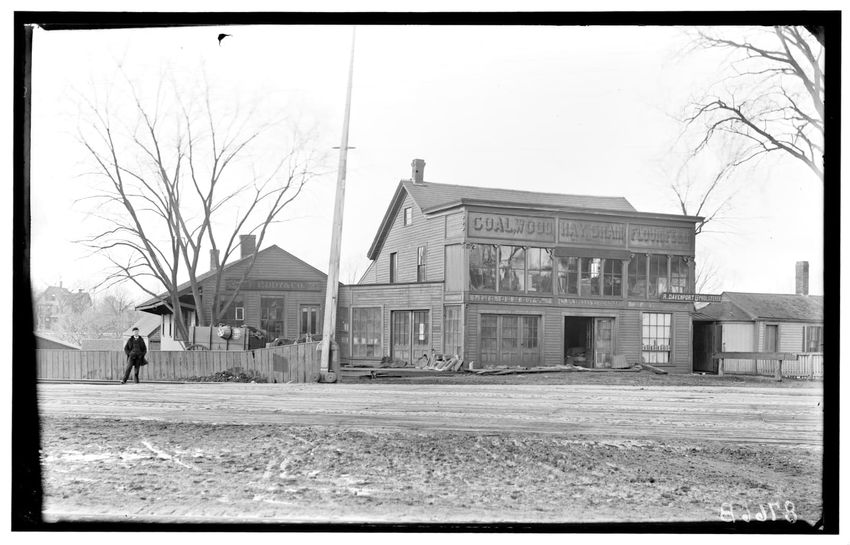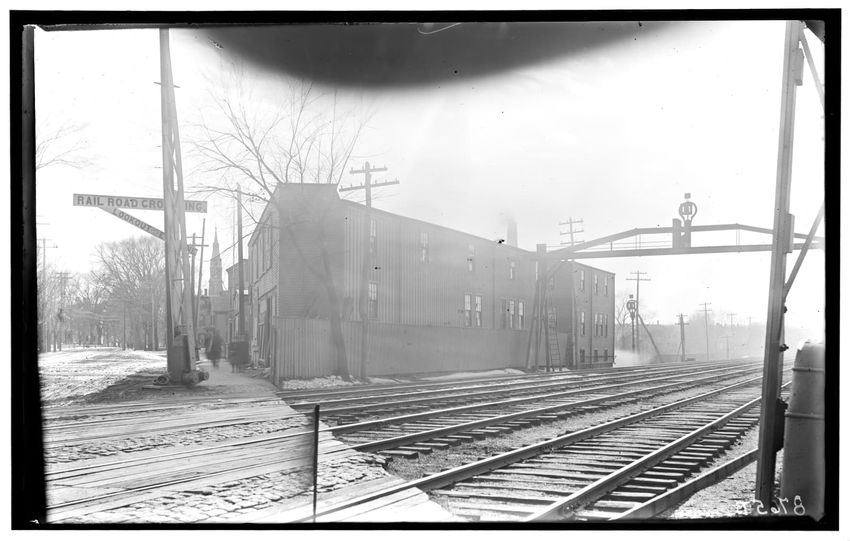 The image depicts a railroad crossing in West Newton, Newton, Massachusetts, featuring two buildings associated with "Eddy's" company. The larger building has signage indicating it deals in coal, wood, hay, grain, and flour & feed. A smaller building with a sign for "R. Davenport Upholsterer" is par...