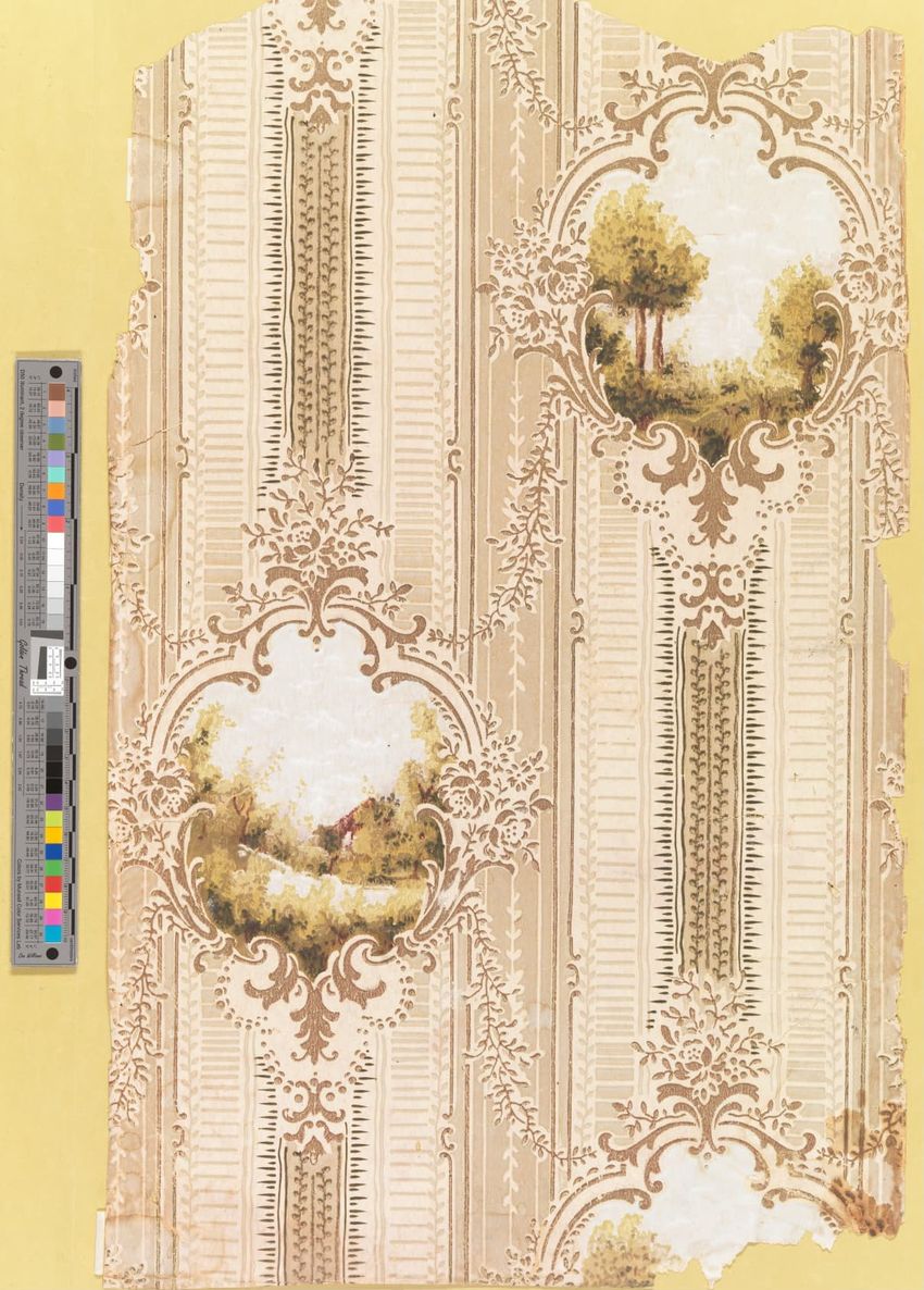 Fragment of roller printed, striped paper. There are landscape vignettes in Rococo cartouches with swags of vines connecting each one. Printed in silver and gold mica, grey, three greens, pale blue and reddish brown on a cream ground.