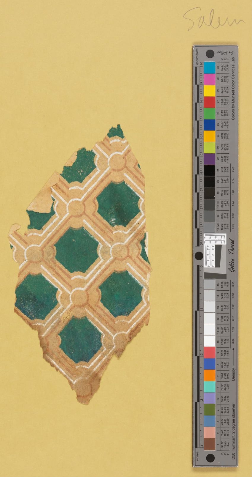 Fragment. Foliate platerwork. Rosettes alternating with bifurcated husk and foliate element with rosette in center. Bordered horizontally by tongue moulding. Printed in brown, tan, white and black on a green field.
