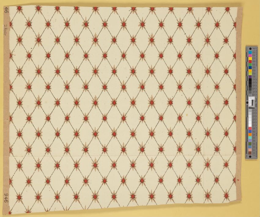 Unused sample. Diaper pattern formed by black dotted lines with red and black stars at the intersections and framing reverse printed ivory centers. On unground paper. Straight match.