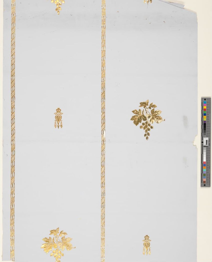 Two unused fragments of wallpaper. Striped, embossed, gilt design of grape or berry clusters alternating with floral sprig sprouting from a heart-shaped element. Gilt on grey ground.