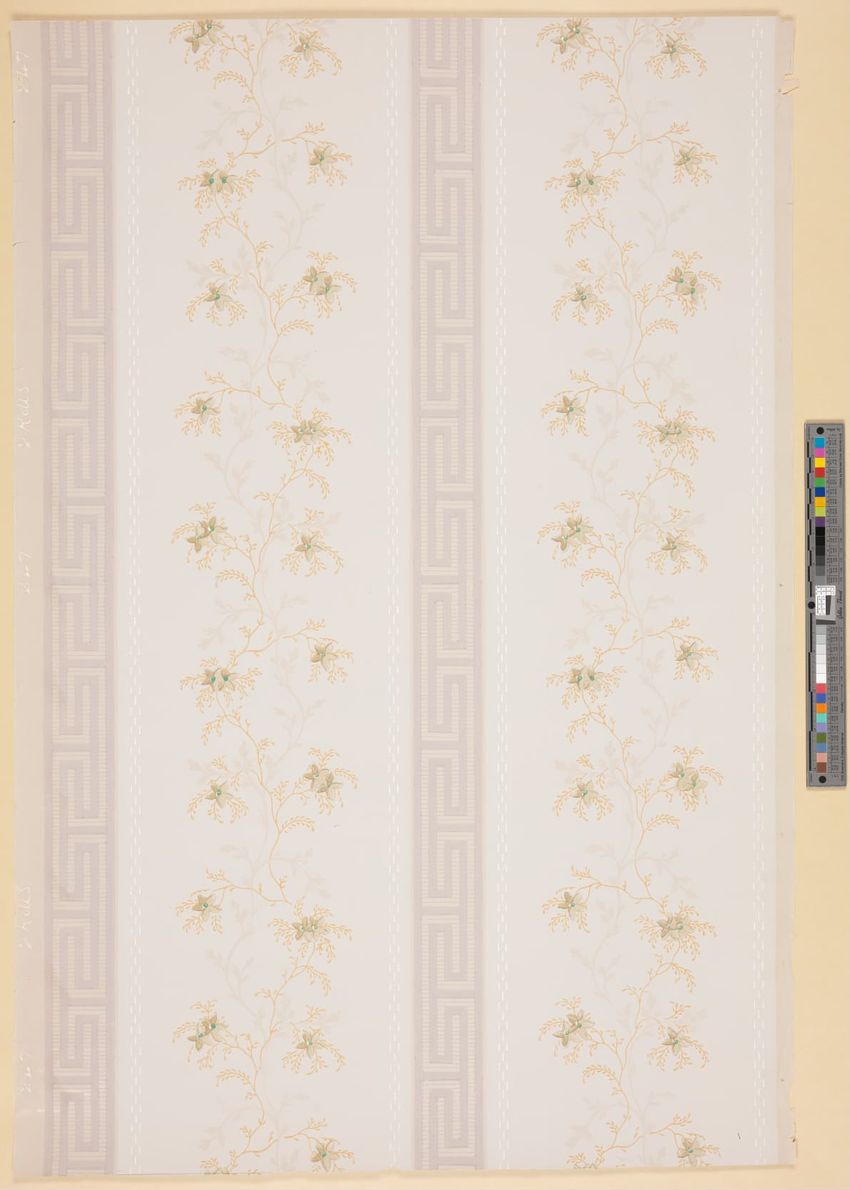 Fragment. Grey Greek key stripe alternating with vertical row of small scale floral vine printed in grey, tan, olive and green. Straight repeat.
