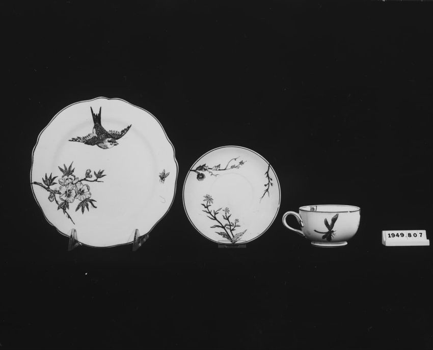 Eight-day mantel clock; rectangular rosewood-veneered case; platform base; two-paneled door, with glass panes; silver-colored metal mushroom knob; lower panel covers works; eglomise and reverse painting on glass image of a bird on a branch painted on lower panel; glass pane above exposes clock face ...
