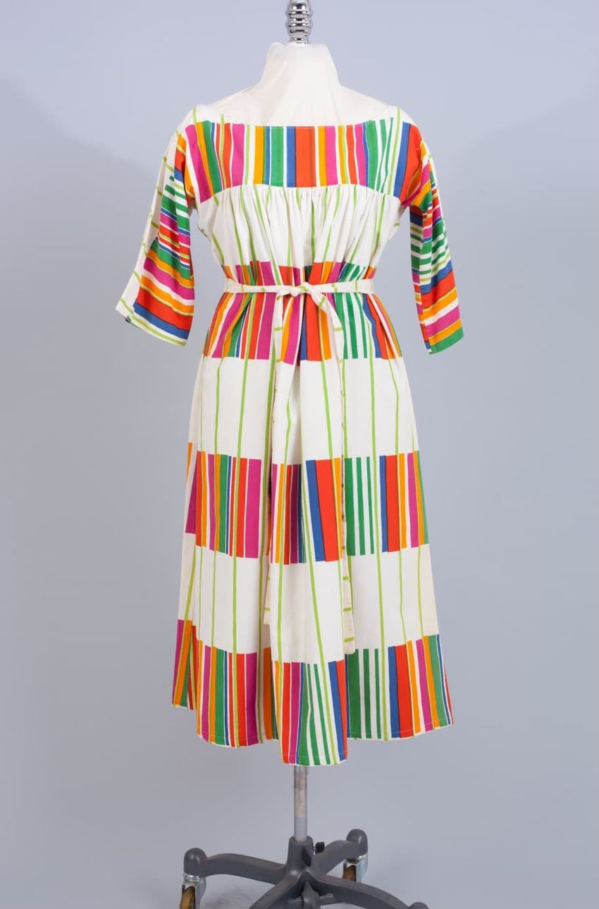 Shirt, collar, long sleeves, single button cuffs, seven button front closure, and single breast pocket. Vertical stripes in lime green, burgundy, and magenta. Size: 14.