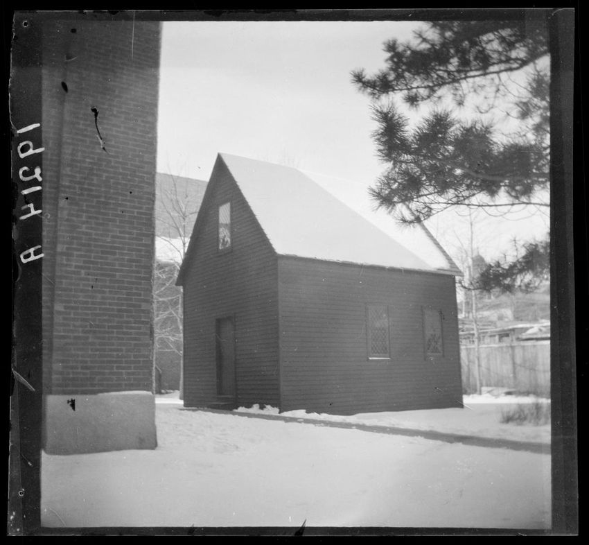 The image shows a small wooden church in Salem, Massachusetts, with a steeply pitched roof. The church is surrounded by snow, and a portion of a brick structure is visible on the left. There are some trees and a wooden fence in the background.