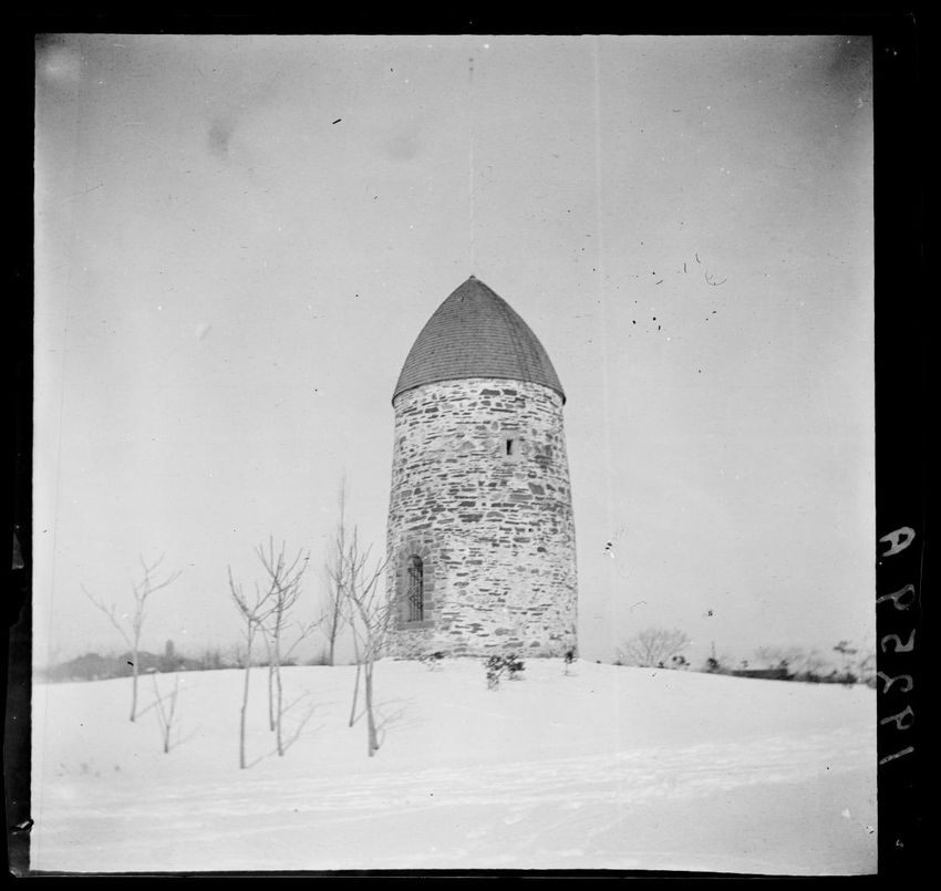 The image shows the Powder House, a round stone structure with a conical roof, located in West Somerville, Massachusetts. It is situated on a snowy landscape with a few small trees in the foreground.