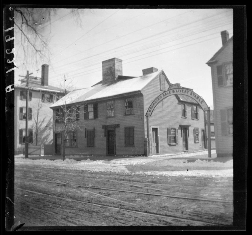 The image depicts the Shattuck House in Salem, Massachusetts. It features a two-story wooden building with visible chimneys and a sign on the side indicating it serves as a "Boarding, Sale & Livery Stable." The house is situated along a street with trolley tracks, and another building is visible nex...