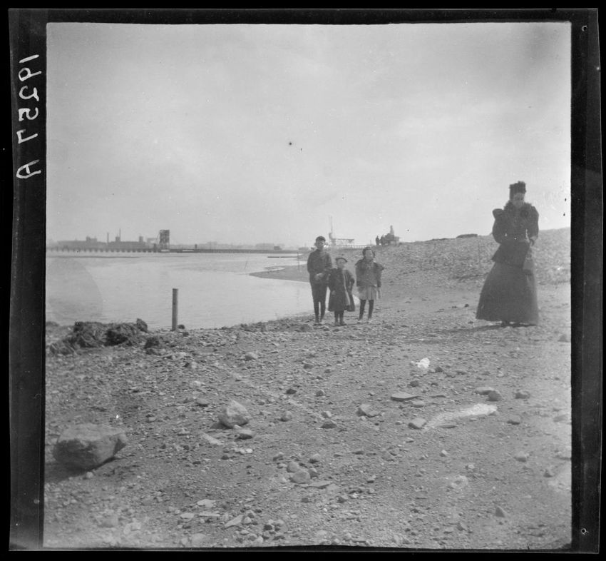 The image shows a rocky shoreline with a body of water in Somerville, Massachusetts, where the "Blessing of the Bay" was launched. There are four people visible: a woman dressed in a long skirt with a hat, and three children dressed in coats and hats, standing by the water. The background includes d...