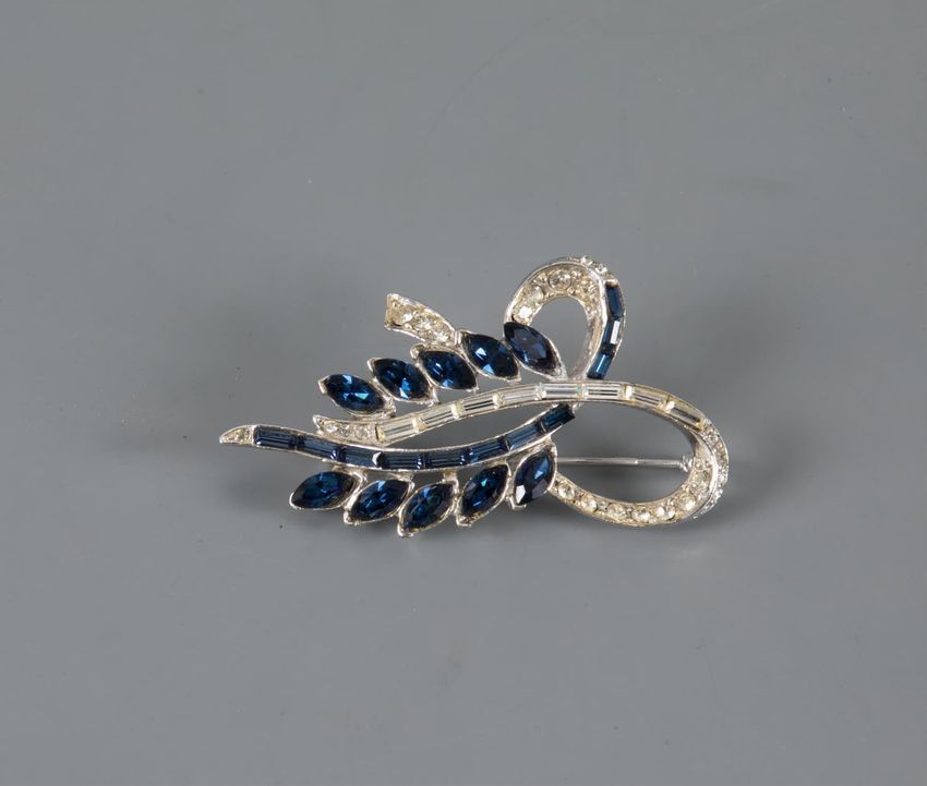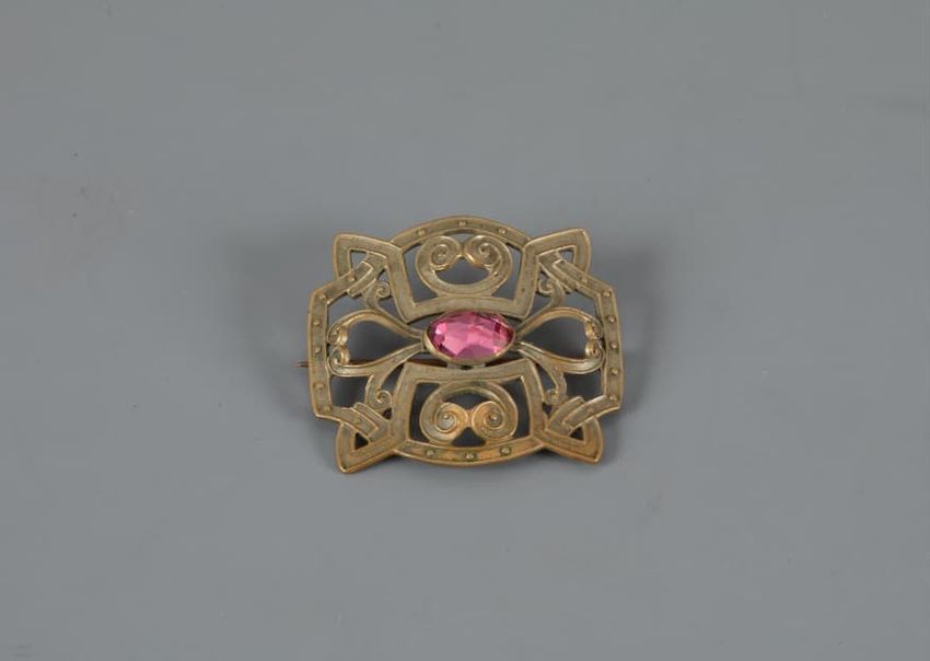 Portrait of a young man facing left with light brown hair, mutton chops sideburns, and blue eyes. He is wearing a black coat with high wide collars, a cream colored waistcoat, and a dark brown paisley patterned stock with a multi jeweled stick pin. Portrait is set deep in a brown wood frame with pai...