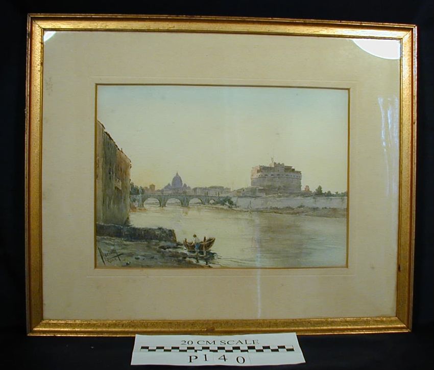 A watercolor painting of a river with a bridge. There are buildings on the opposite side, one of which is domed. There is a man and his boat at the bottom of the picture. The frame is painted gold with a raised outer edge.