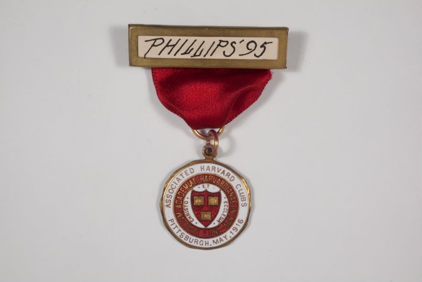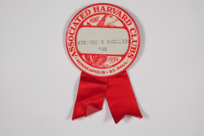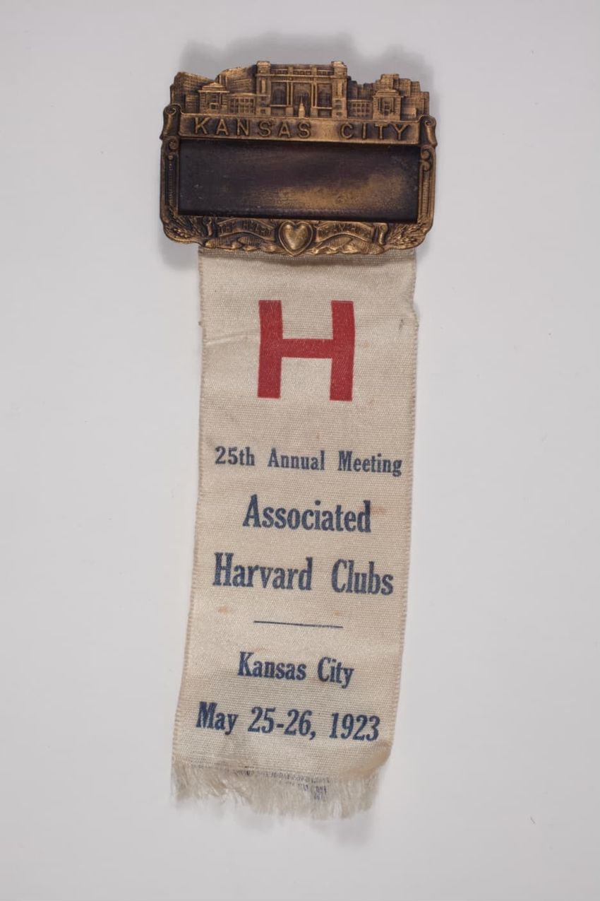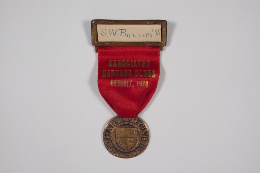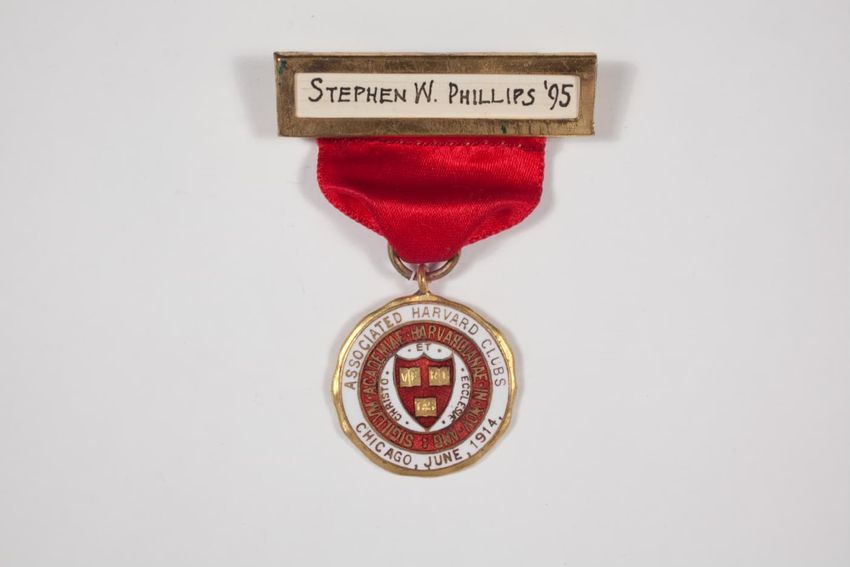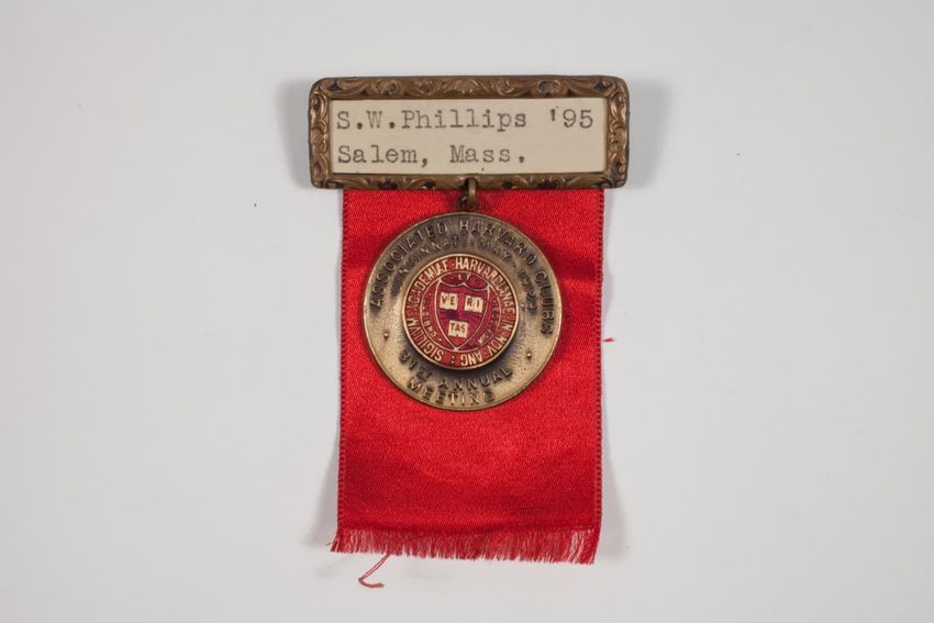 A small badge with a solid red ribbon backing. There is a name pate with an ivy scroll border and white paper with black ink. Hanging from the name plate is a aged bronze circular medal with a smaller round red circle that has the Harvard seal on it. On the back is a manufacturerer label, that stick...