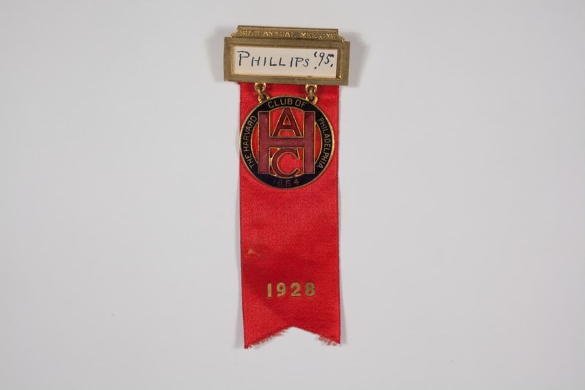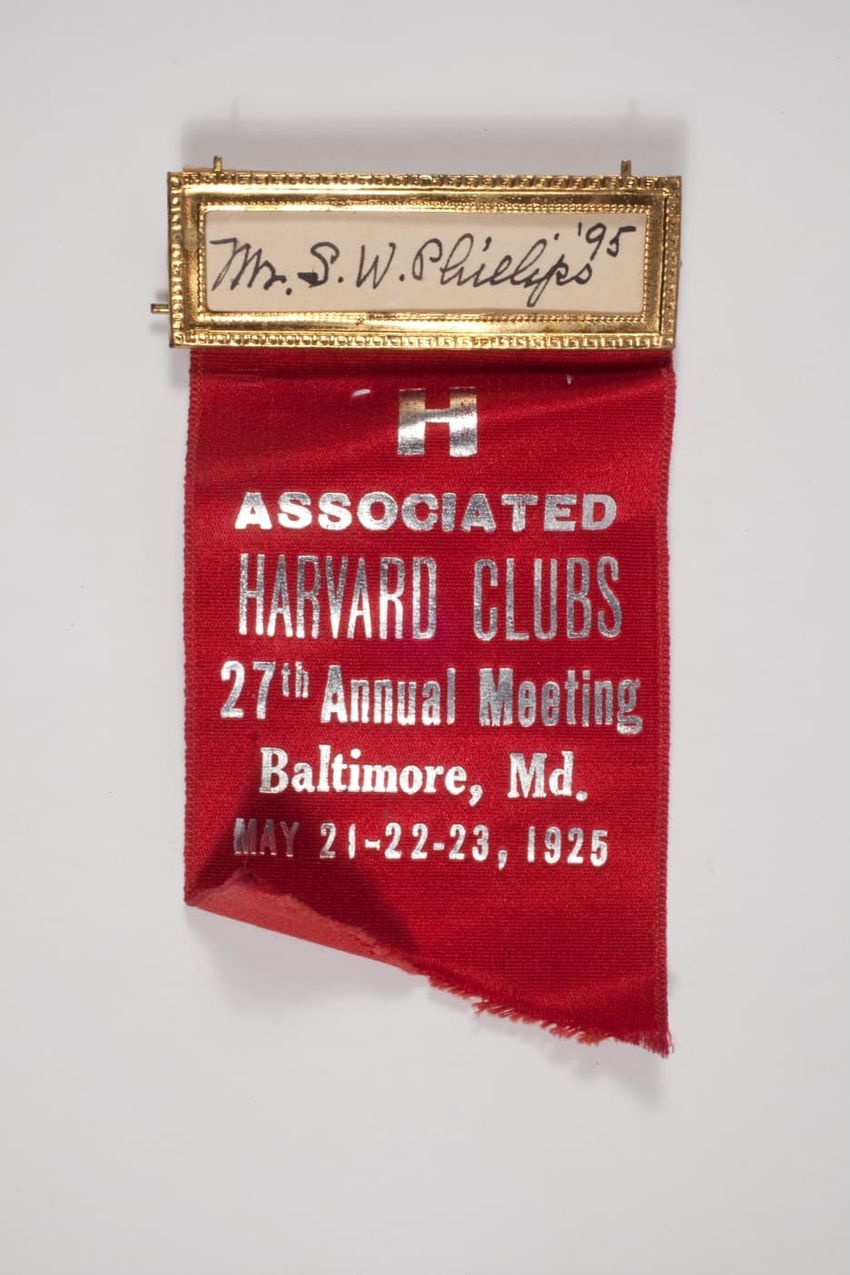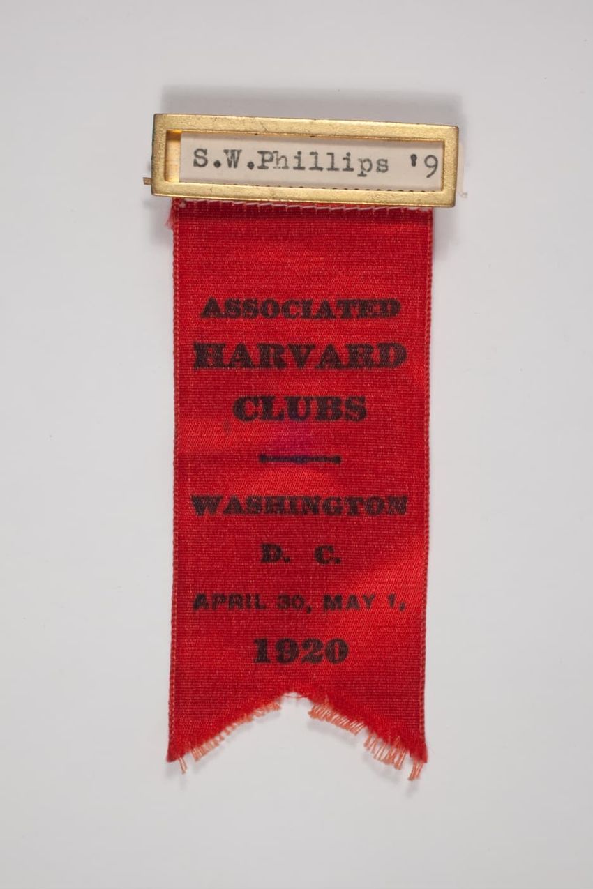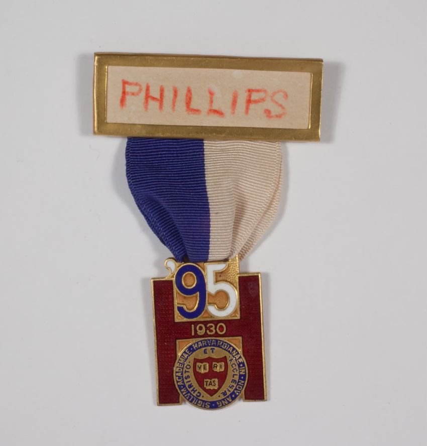 A small badge with a solid red ribbon backing. There is a name pate with an ivy scroll border and white paper with black ink. Hanging from the name plate is a aged bronze circular medal with a smaller round red circle that has the Harvard seal on it. On the back is a manufacturerer label, that stick...