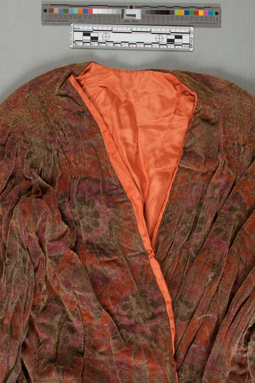 Mid-length, light-weight jacket with orange silk lining and, on exterior, printed velvet with longer gold threads. Printed velvet has stylized floral pattern in light gray, dark orange, dark gray, and magenta. Shoulders are gathered and stitched in decorative way. Sleeves are long and full with wide...
