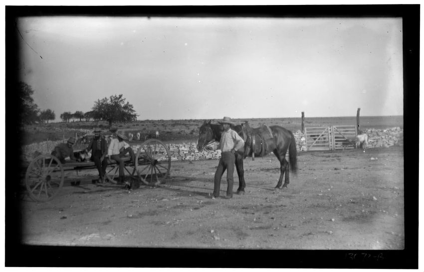 The image depicts several unidentified men working on a farm. In the foreground, two men are sitting on a cart with large wheels, while another is standing beside a horse. In the background, there is a gate, stone structures, and trees lining the horizon.