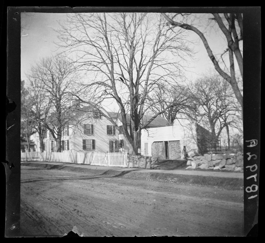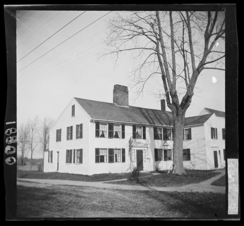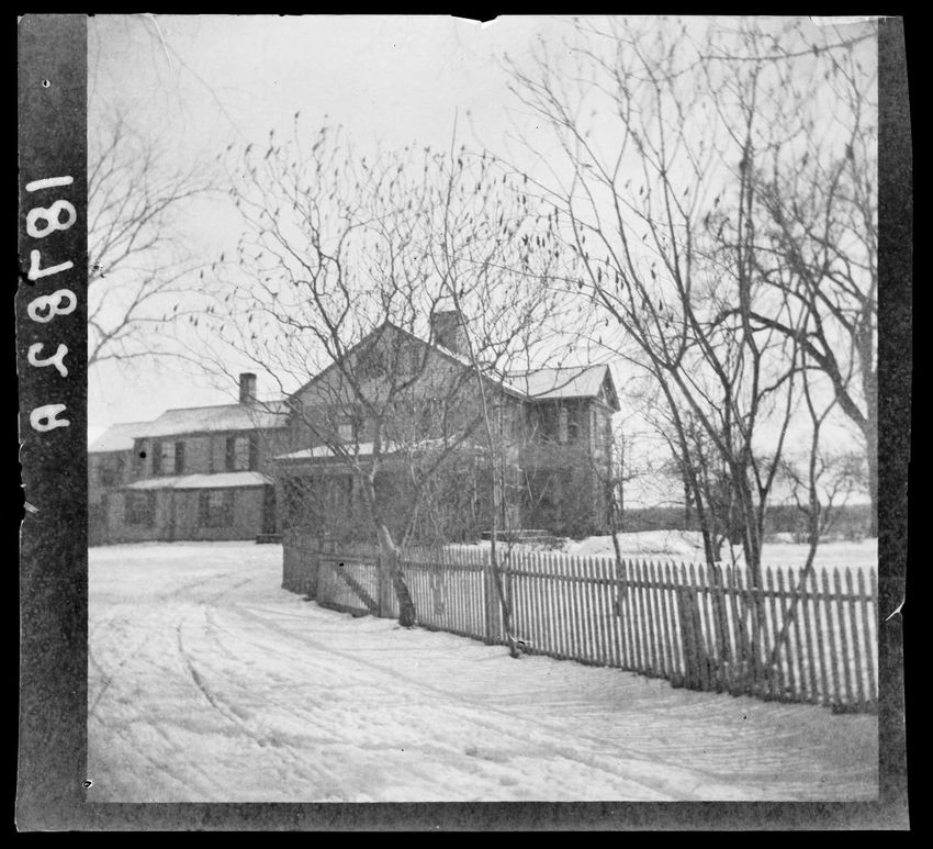 The image shows Fitch Tavern in Bedford, Massachusetts. It is a large, multi-story wooden building with several windows, a gabled roof, and a prominent entrance. The structure is surrounded by a white picket fence, and there are large trees nearby, with snow visible on the ground.