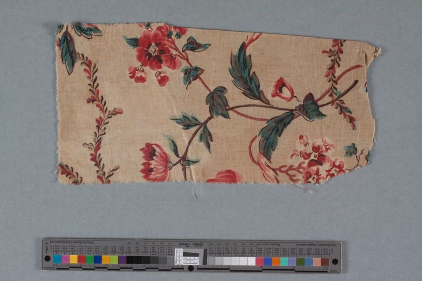 Large red, brown and blue leaves on brown background. Machine stitched plain weave black binding around edges. (skips in stitches and changes of stitch lengths). Illegible twill tape tag and paper tag knotted with string to tag.