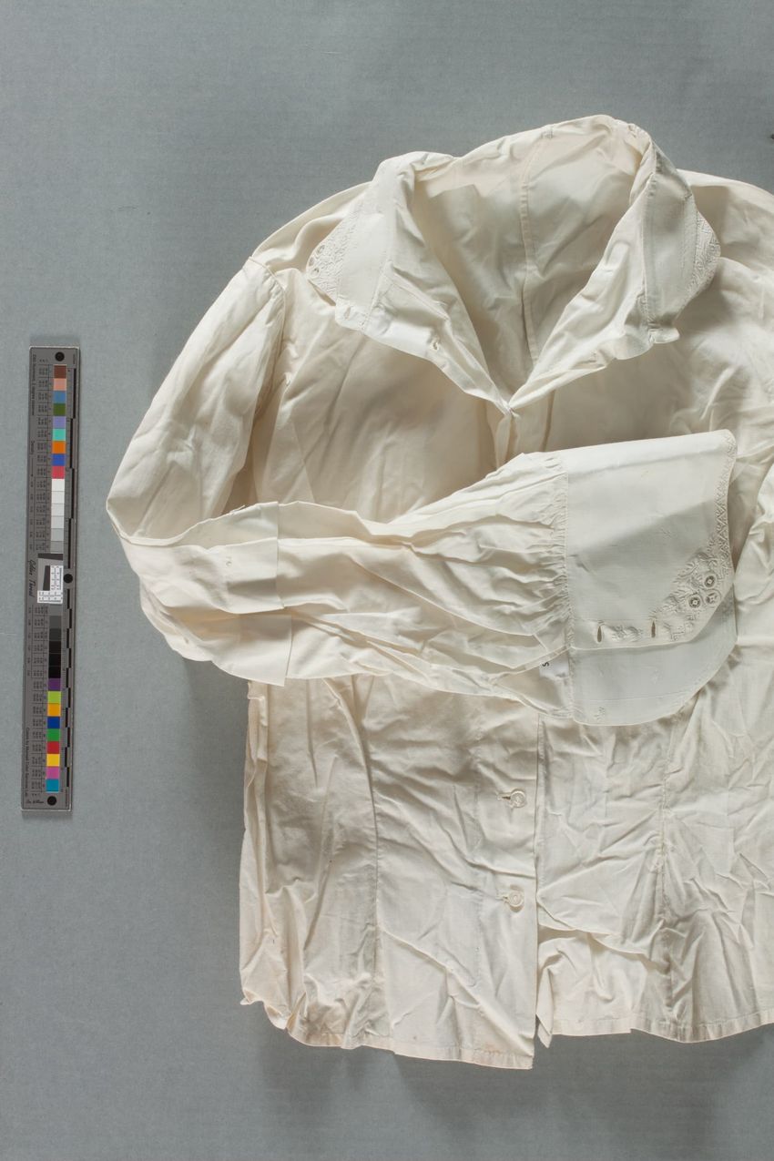 White cotton button-up blouse, wide two-button cuffs with embroidery at cuffs and collar, buttons, fine piping at shoulders.