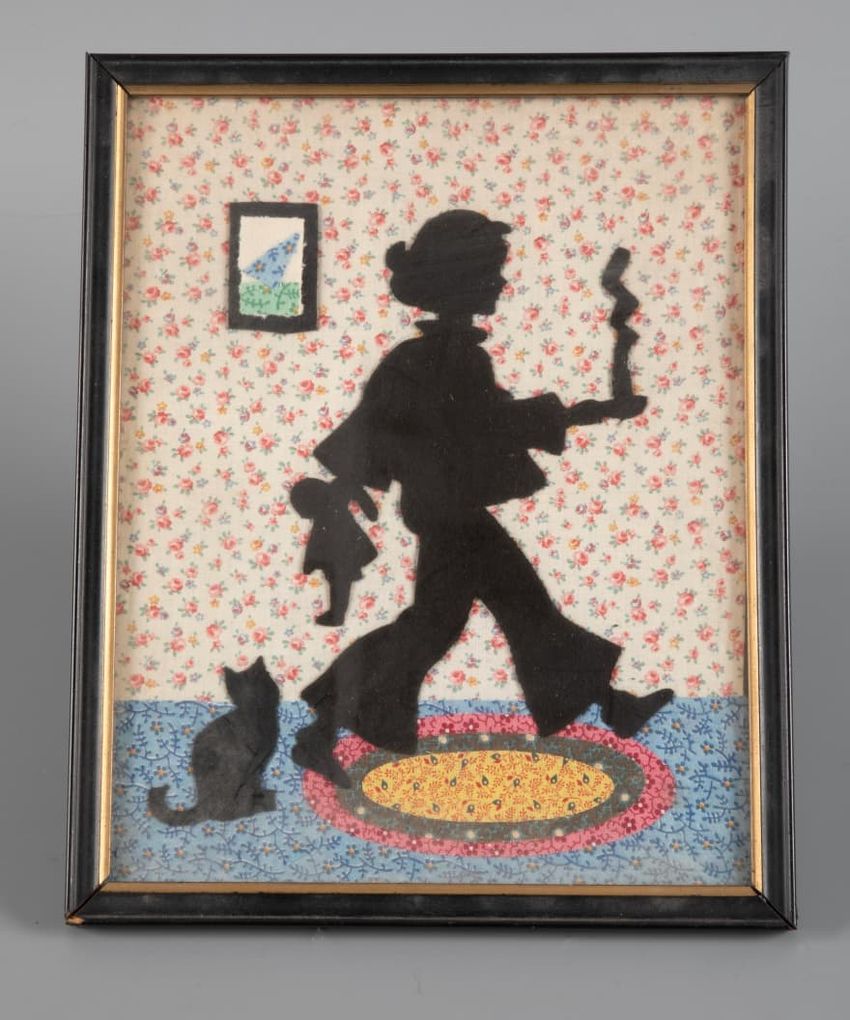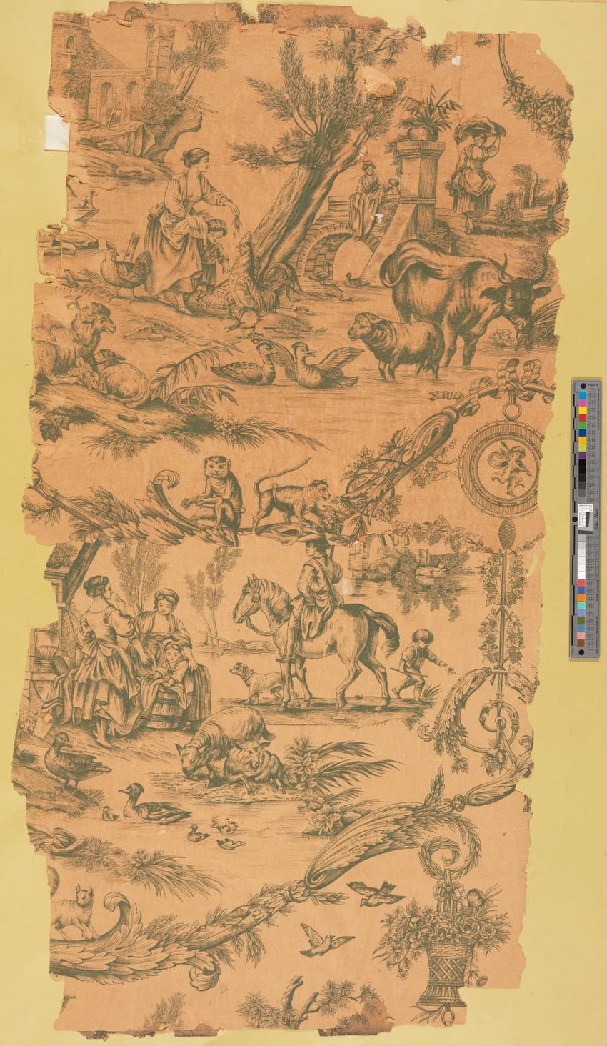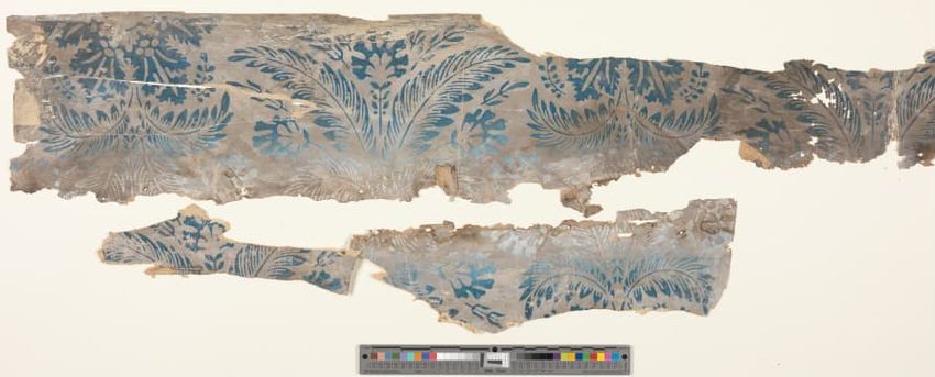 Unused wallpaper fragment. Bouquet and sprig pattern. Large bouquets of pink and white apple blossoms alternate with small sprigs of violet flowers. Block-printed in twenty-four colors: yellow, white, three olives, four greens, red, two pinks, three mauves, three browns, blue, aqua, four violets ...