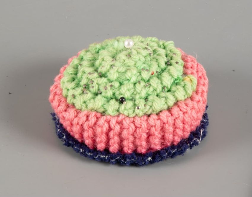 Bulldog Tidy Pins in original package. Twelve pins for 15 cents. Package is paper in red, black, and white. Pins are metal. Package includes a bulldog face and image of a living room chair, nightstand, and lamp. Package prints says, will keep tidies smooth and straight. And For fastening tidies a...