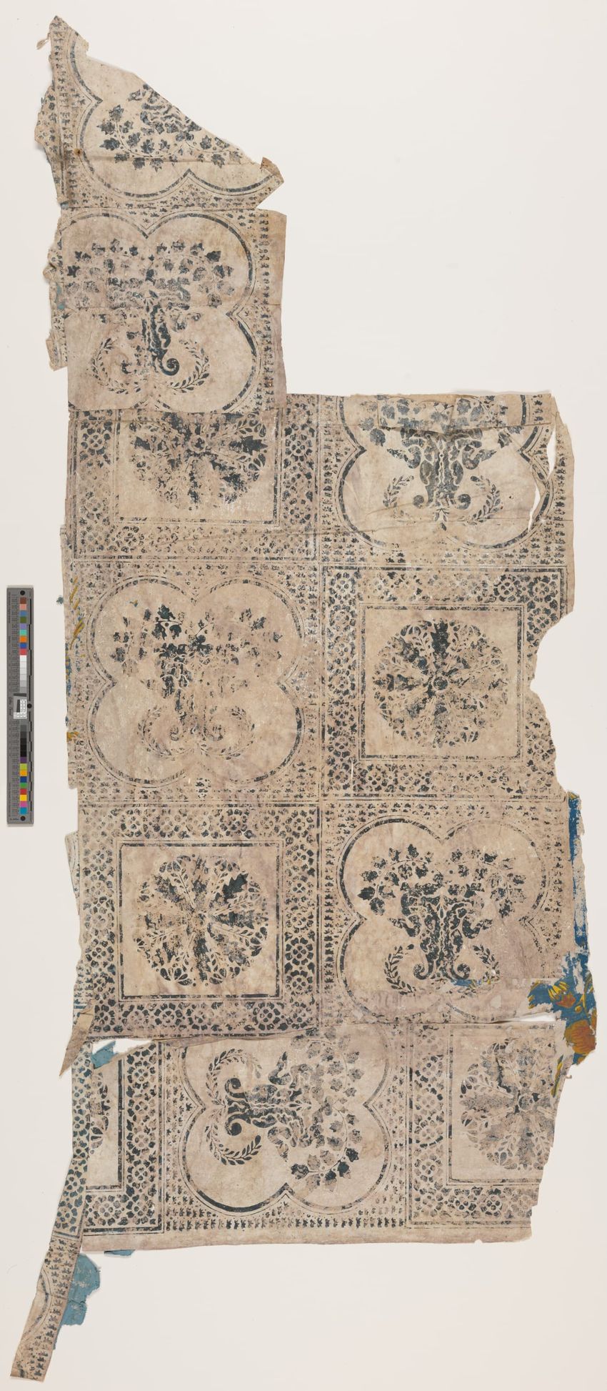Wallpaper fragment from the Clapp House in Dorchester, Massachusetts. English Pillar and Arch pattern block-printed and stenciled. Architectural elements in light blue, gray and black on gray ground. Floral swags and leaves, in green, pink and red, adorn the architectural elements. A small piece ...