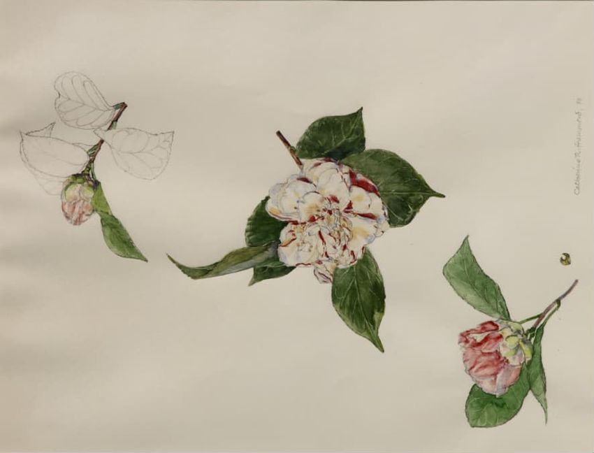 Watercolor painting, two views of a pale pink camellia. One view of a full blossom with two leaves, another view of a partially painted and sketched group of leaves and tightly closed bud. Plain gold painted frame.