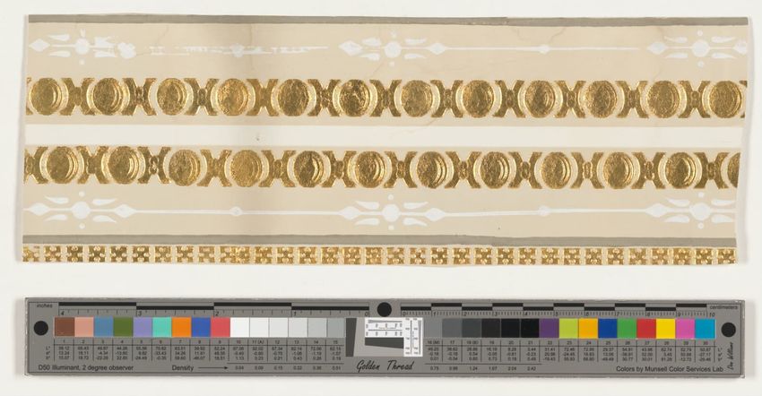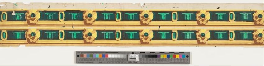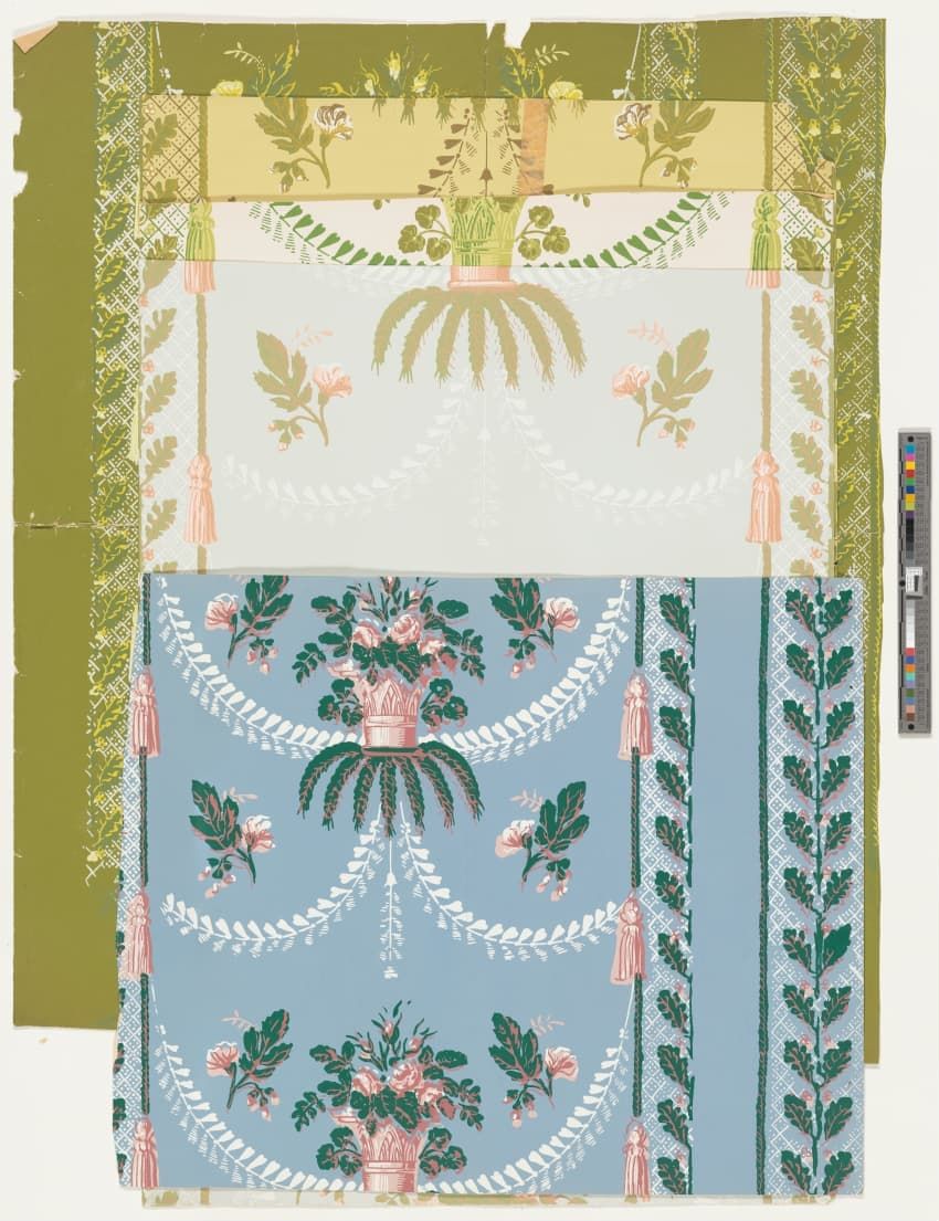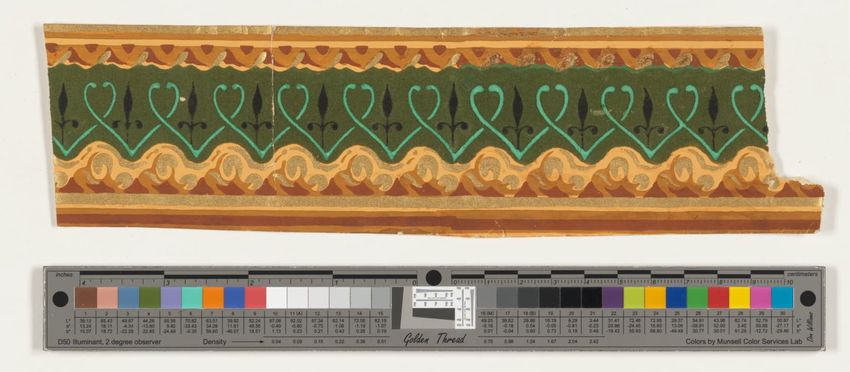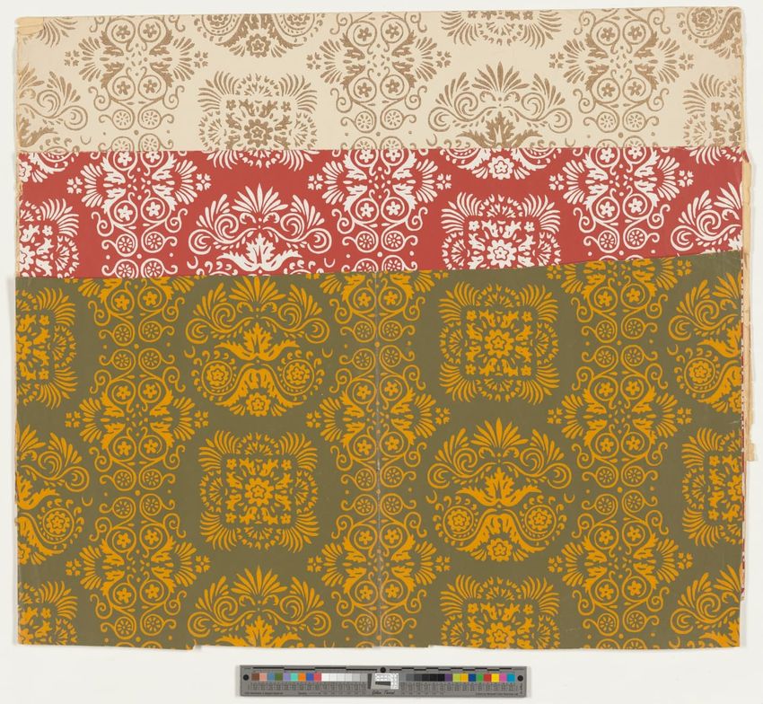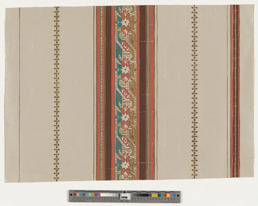 Fragment of floral wallpaper border with trimmed edge. Naturalistic pink flowers and buds on green leafy branches or grasses. Flocked red background is overprinted with black to emulate shadow. Block-printed in two greens, two browns, yellow, two pinks, mauve, red, black and red flocking on olive g...