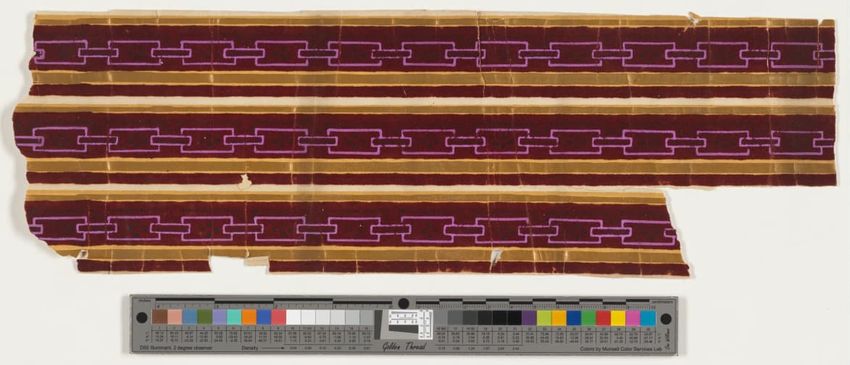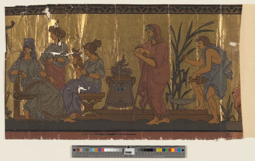 Fragment of a pictorial wallpaper border from Hodgdon's Island, Boothbay, Maine. Greek figures in various poses against metallic gold background. Fragment does not include a full repeat. Roller-printed in black, two browns, green, blue, gray, nude, and metallic gold on mauve ground. Paper is mach...