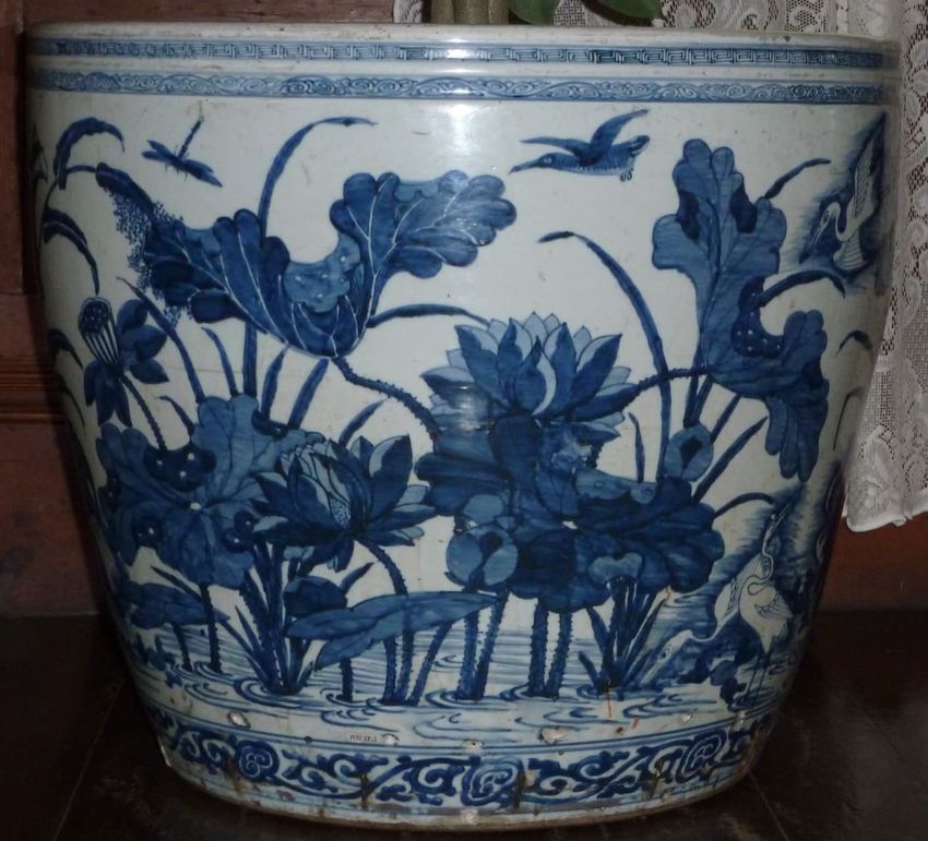 Porcelain fish bowl with blue chrysanthemum pattern.