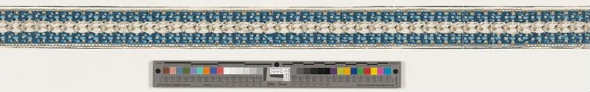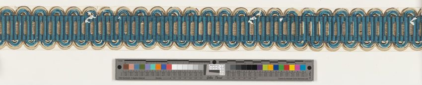 Fragment of gimp wallpaper border. Narrow blue and tan border with pattern resembling woven gimp. Block-printed in white, two tans, black and three blues on white ground.
