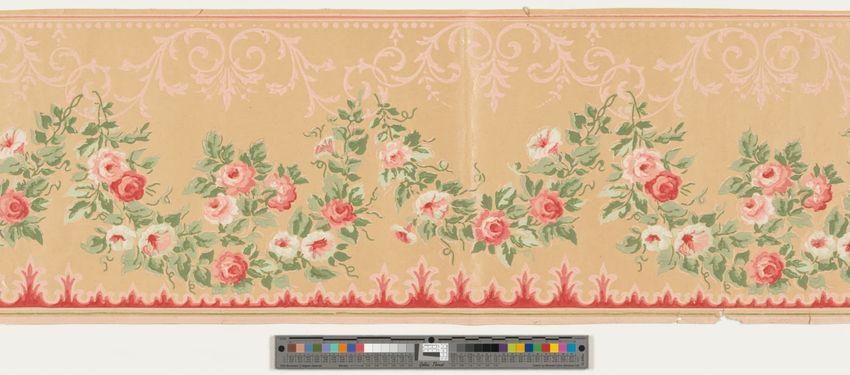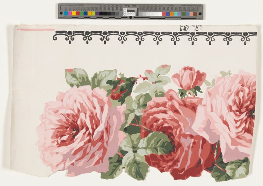 Two fragments of rose wallpaper border with trimmed edge. Large pink and red roses and foliage on a white background. The lower edges of the border have been trimmed around the rose pattern. A black geometric band made up of circles, dashes and c-scrolls runs along the upper edge of the border. ...