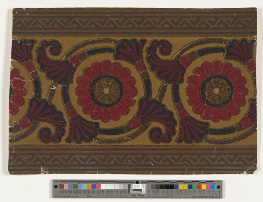 Fragment of wallpaper border with anthemion pattern. Central band with large anthemion figures in white and brown over olive and ochre background. Pink band with white dots and dashes runs along upper edge of border. Pink band with white dots, dashes and stylized flowers runs along lower edge of ...
