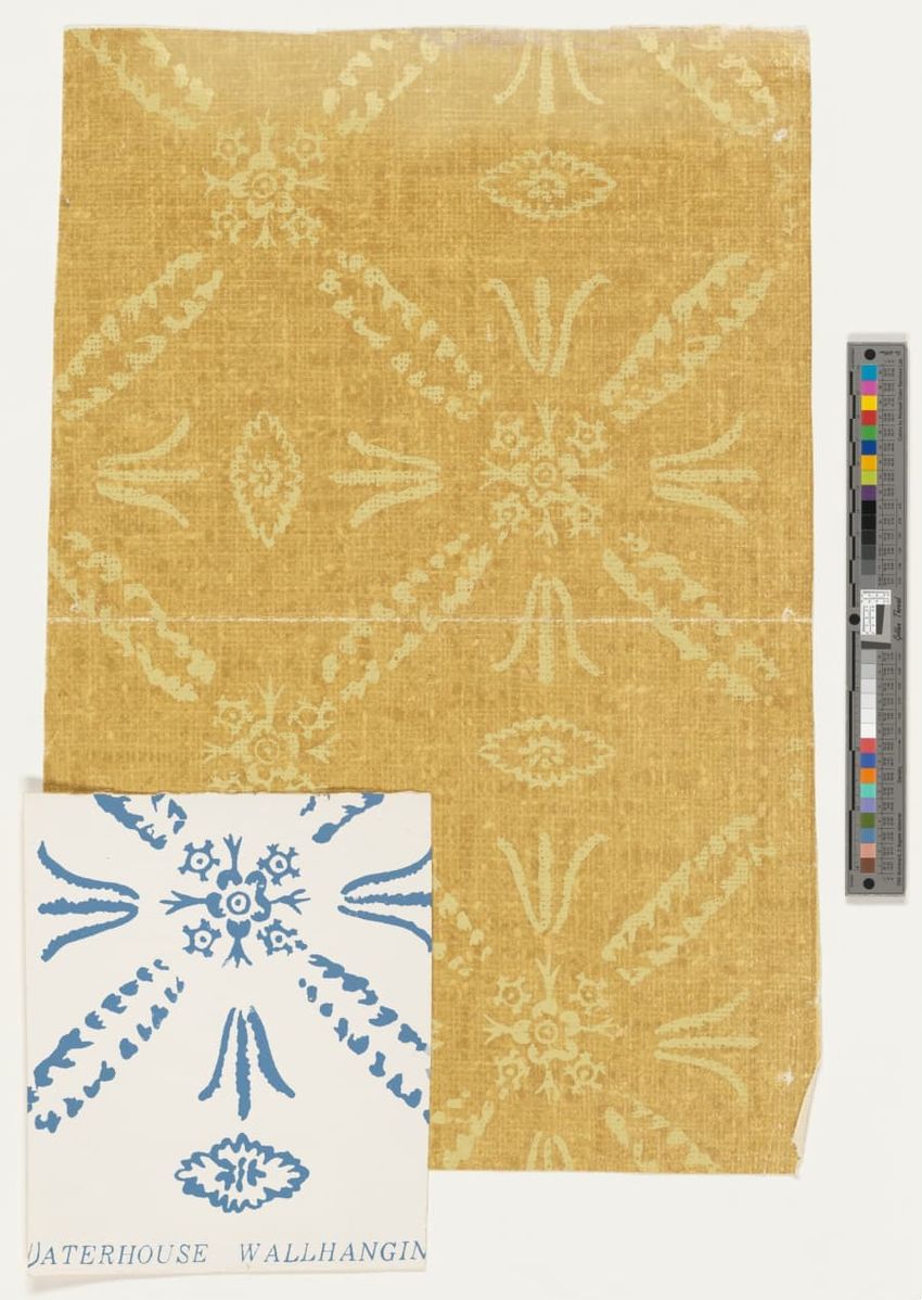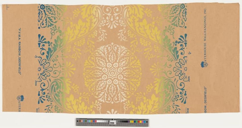 Unused sample of reproduction wallpaper in the "P.V.M.A. Rainbow, Deerfield" pattern (#321) by Waterhouse Wallhangings. Wallpaper has an irisé or rainbow design of repeating floral medallions separated by scrolling, flowered leaves. Printed in blended blue, yellow and white on an ungrounded paper. P...