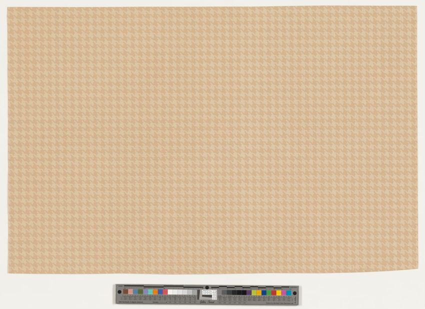 Unused sample of reproduction wallpaper in the "Houndstooth" pattern (#159463) by Waterhouse Wallhangings. Paper has an all-over small houndstooth geometrc pattern. Roller-pinted on textured paper in brown on a beige ground.