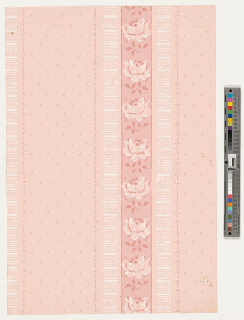 Fragment of floral wallpaper border. Wide border with four pattern bands. Uppermost band consists of thin pink stripes and a row of pink dots. Below it is a band of pink foliate scrolls. The third and widest band is swags of roses and morning glories in shades of pink and green. The swags hang f...