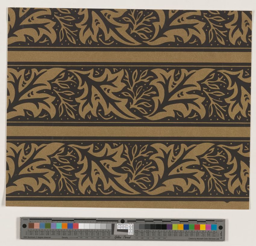Fragment of wallpaper border with fretwork pattern. Roller-printed black Greek key fretwork pattern on metallic gold ground. . "6014 / Made in England" stamped on verso. "15 [cent symbol]" written in pencil on verso.