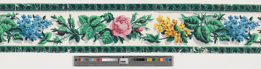 Fragment of rolled wallpaper border. Naturalistic floral pattern of blue lilacs, pink roses and yellow forsythia with foliage on white background. Green bands with black stylized, undulating vines run along upper and lower edges of the border. Block-printed in two greens, black, gray, yellow, ora...