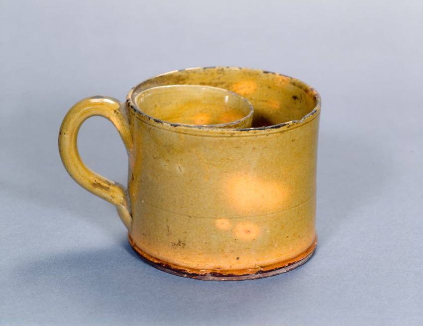 Oversized mug with strap handle. Inside and outside covered with olive green glaze varied with deep yellow-orange spots (some rust-color glaze near base); interlaced with wavy lines incised near top rim. Some spray/sponge-like dark glaze coloration covers some of outside.